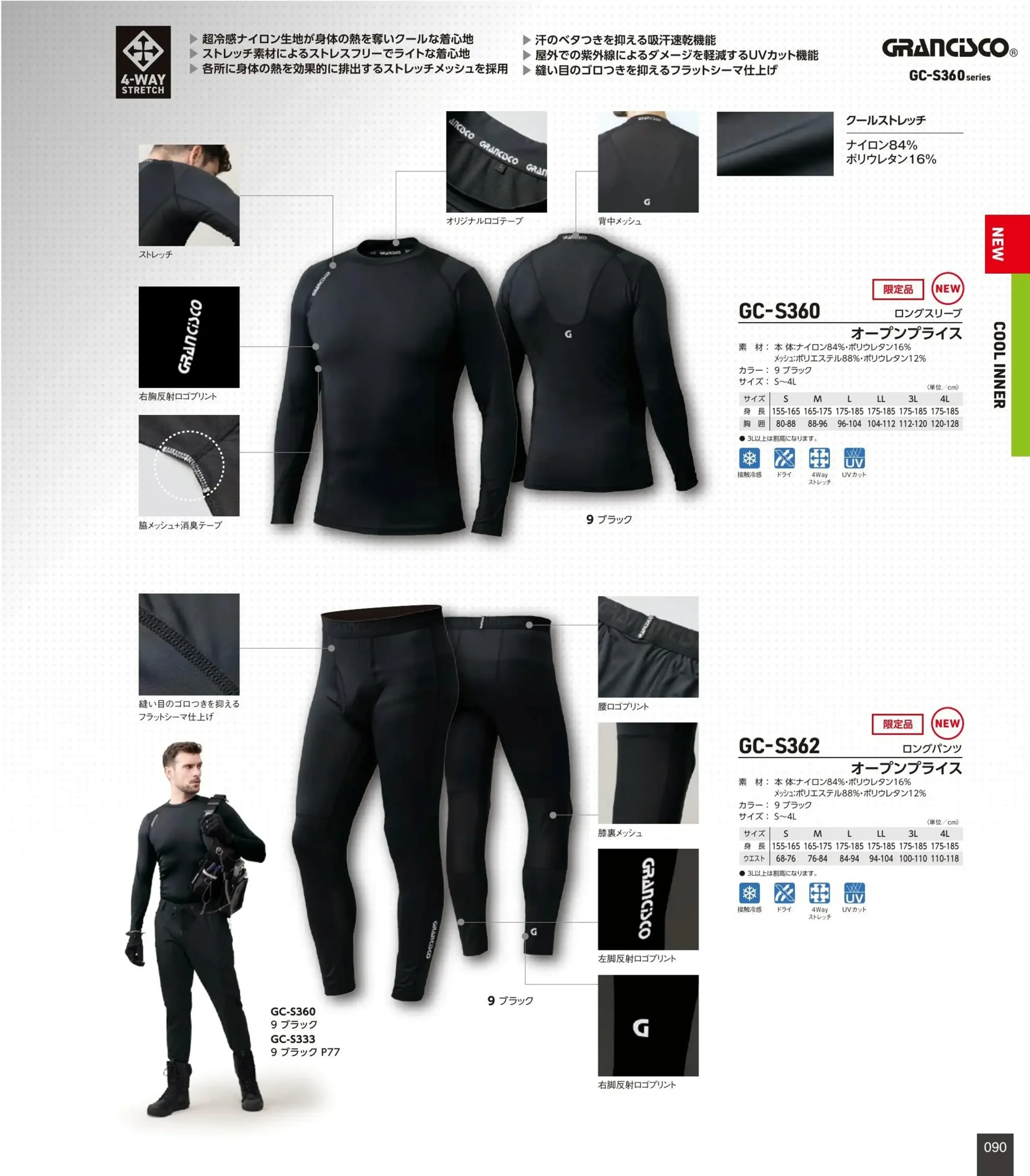 GRANCISCO GC-S362シリーズのクールストレッチロングパンツ。ナイロン84%・ポリウレタン16%の高伸縮素材を採用し接触冷感と吸汗速乾機能を両立。身体にフィットする設計で動きやすくアクティブな現場でも快適な着用感を実現します。