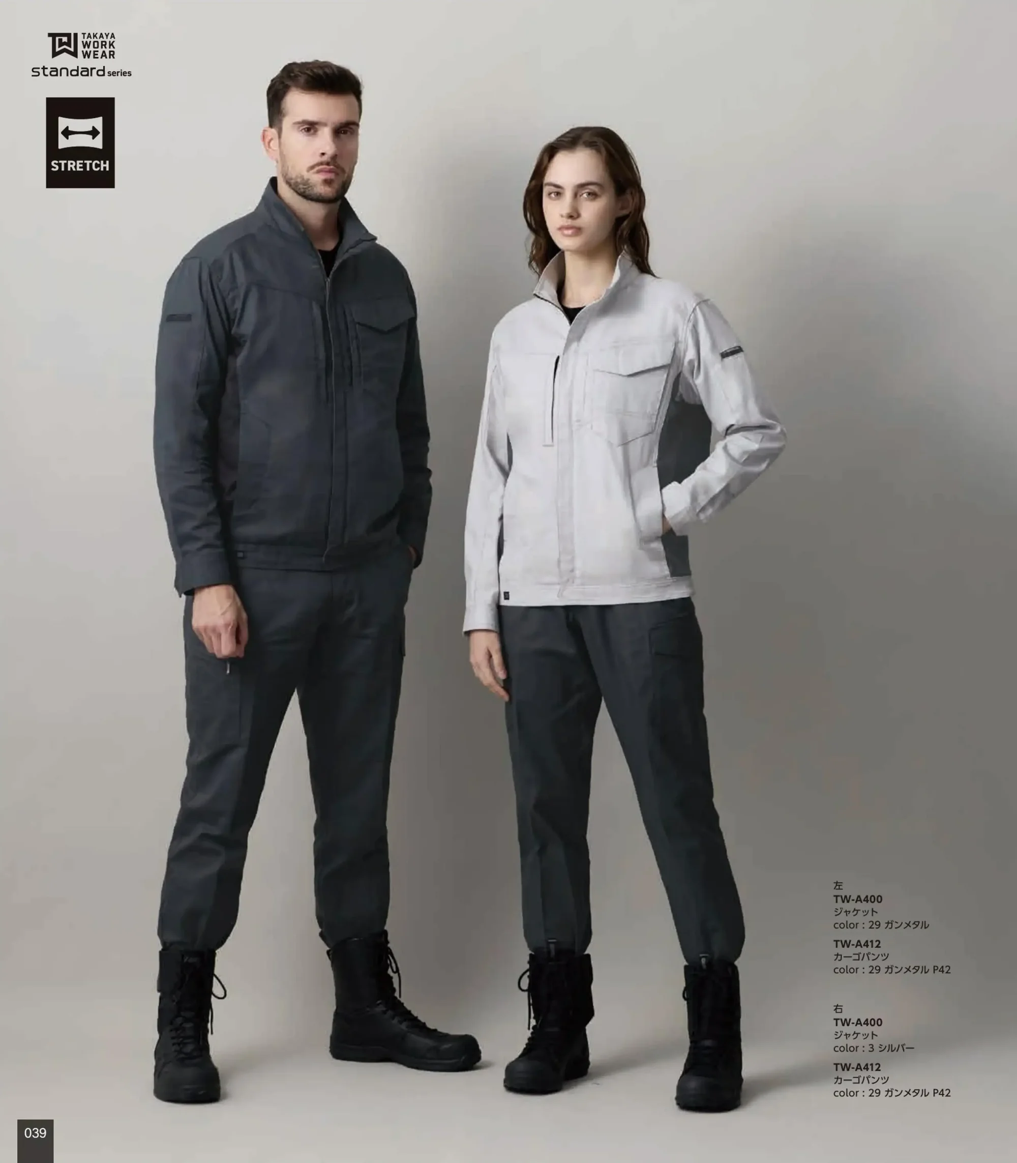TAKAYA WORK WEAR standard seriesの綿100%ストレッチジャケット。日清紡テキスタイルの加工技術により伸びて快適に戻る高品質な日本製ストレッチ素材を採用。収納力と動きやすさを兼ね備え多様なワークシーンに対応します。