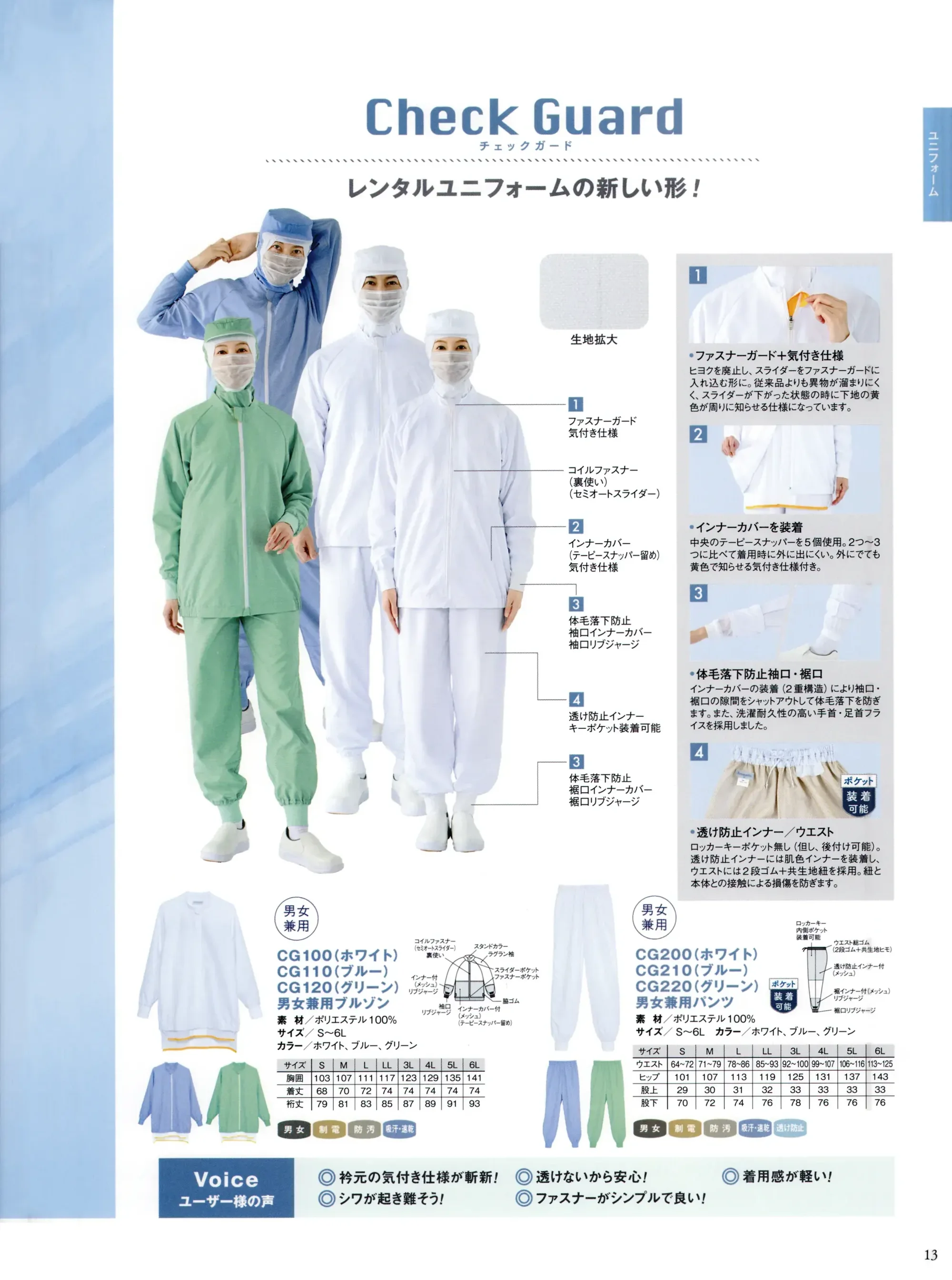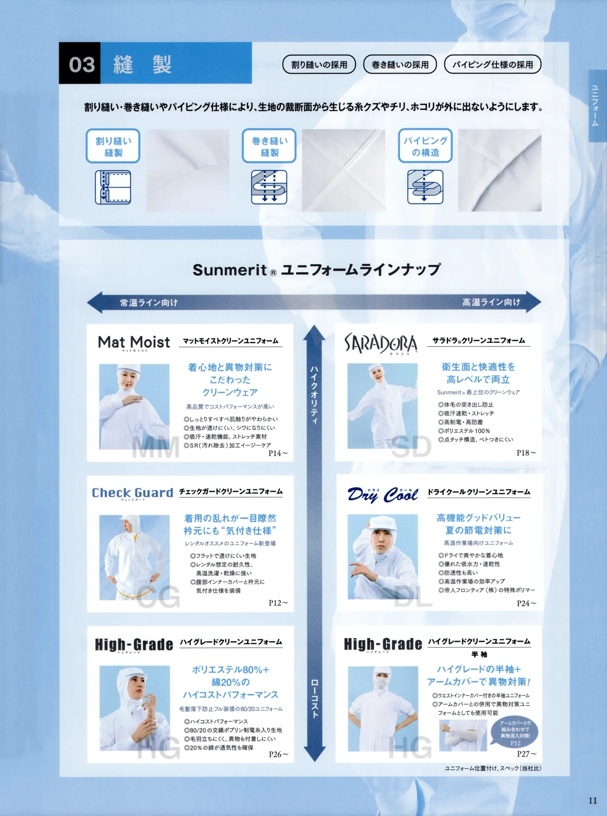 | 素材特長 | 吸汗速乾、肌触りがいい、制電、ストレッチ、優れたSR性(防汚)、透けにくい CLASS10000~100000 |