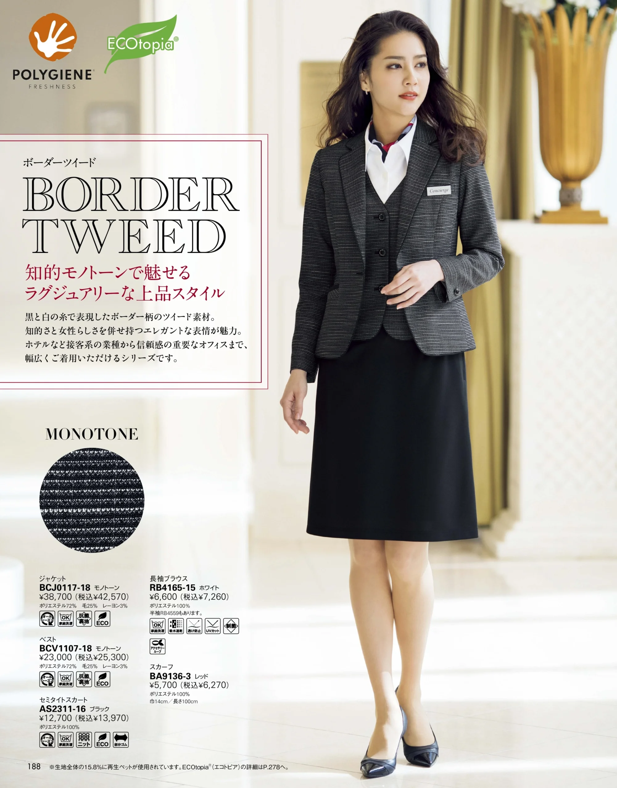 モノトーンで表現したボーダー柄のツイード素材。知的さと女性らしさを併せ持つ、エレガントな表情が魅力です。