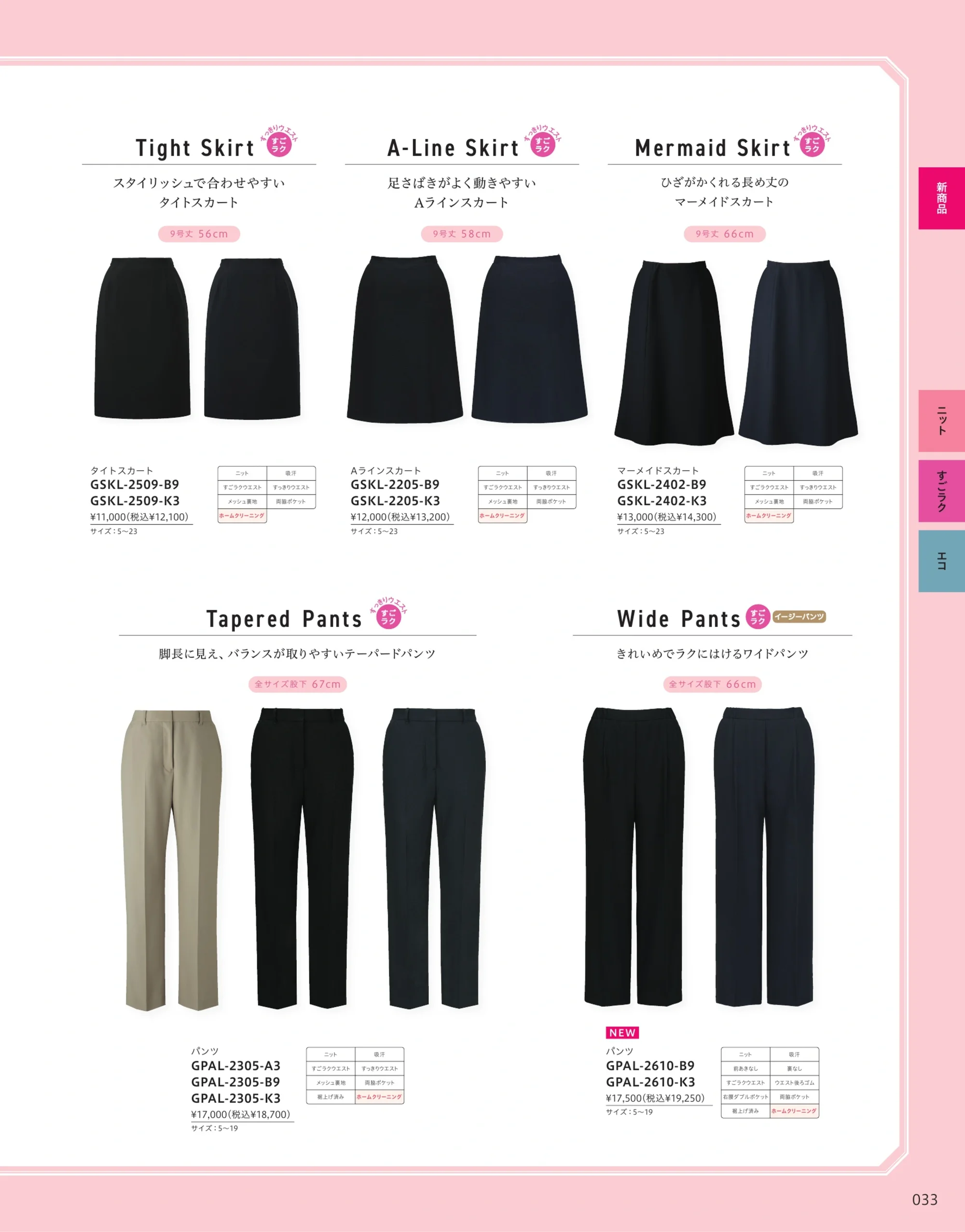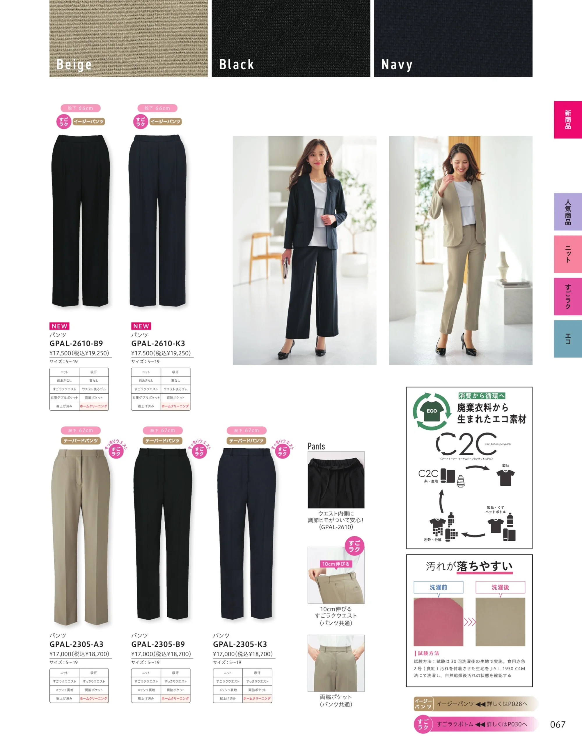 | 形状特長 | すごラクウエスト、ウエスト後ろゴム、前あきなし、裏なし、両脇ポケット、右腰ダブルポケット、後ろ左右ポケット |
