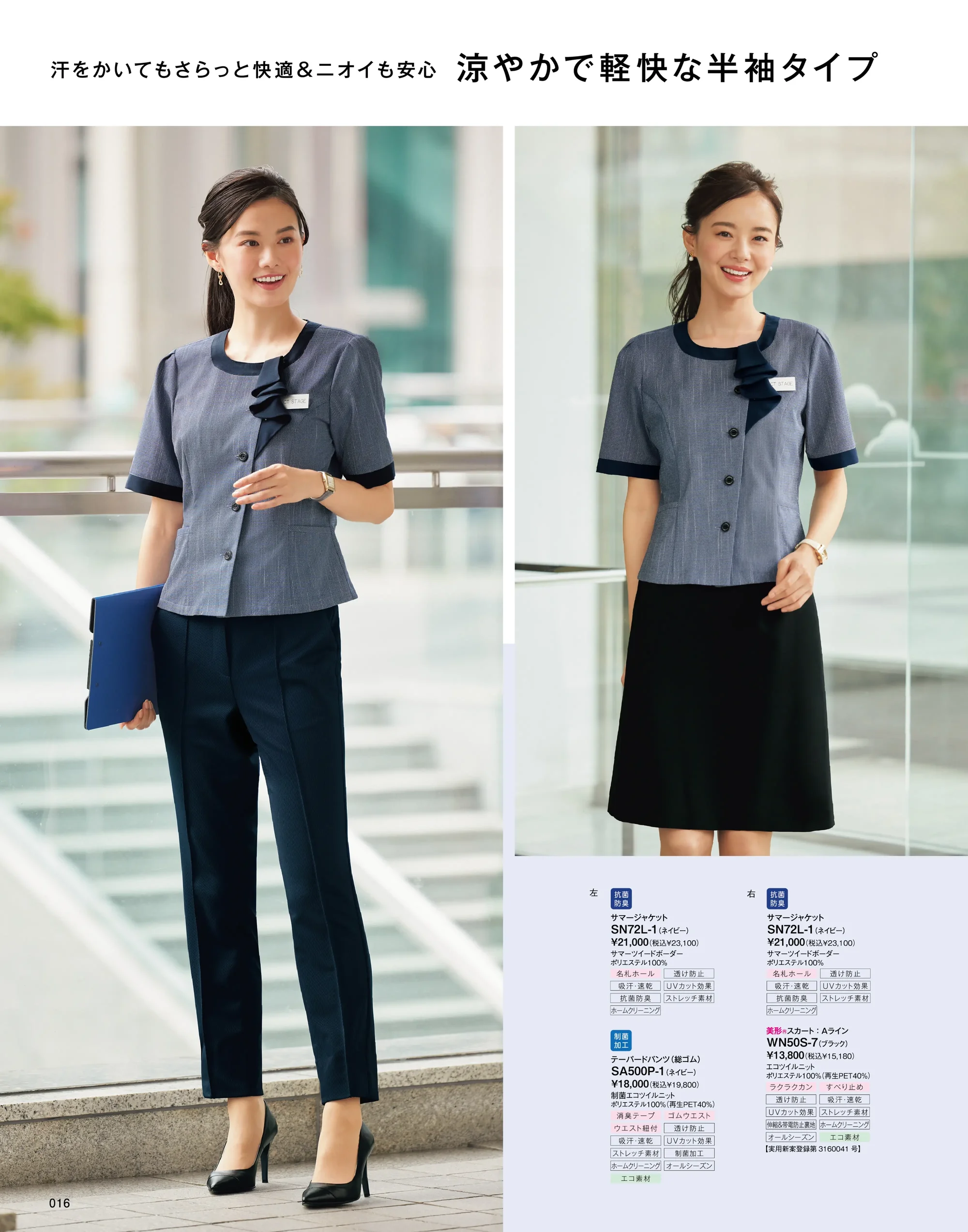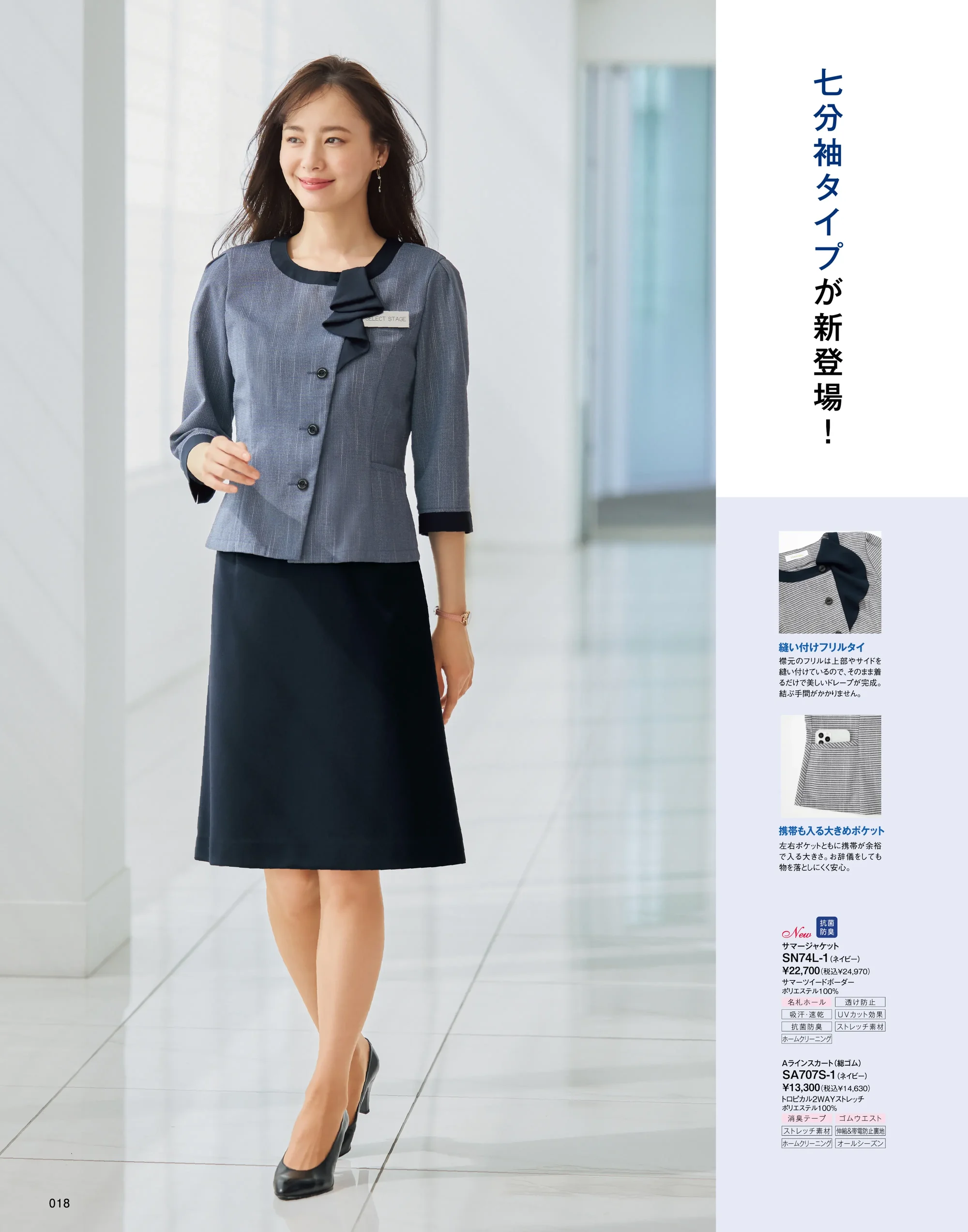 | 形状特長 | 名札ホール、左右ポケット、縫い付けフリルタイ、七分袖 |