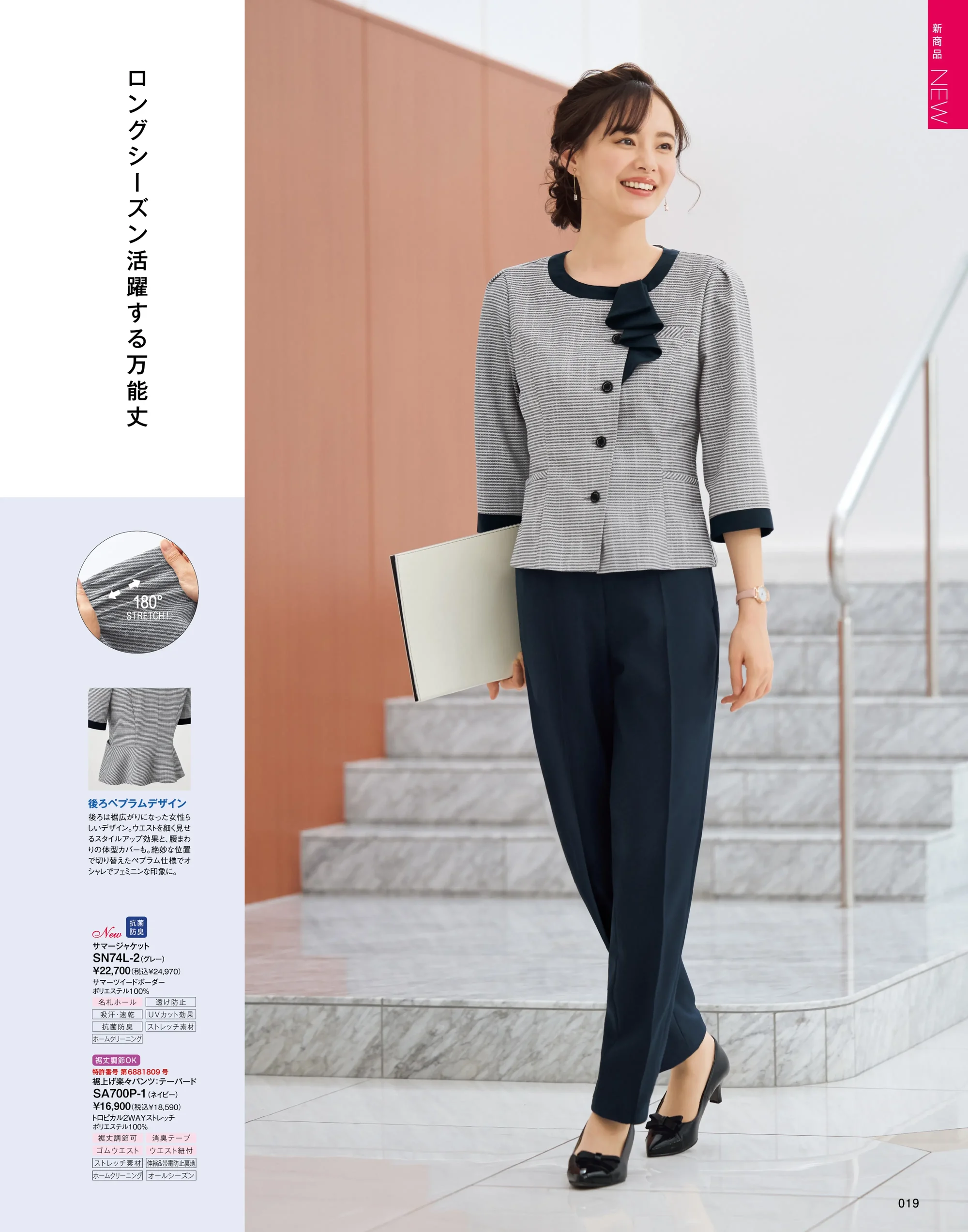 ・後ろペプラムデザイン:後ろは裾広がりになった女性らしいデザイン。ウエストを細く見せるスタイルアップ効果と、腰まわりで切り替えたペプラム仕様でオシャレでフェミニンな印象に。