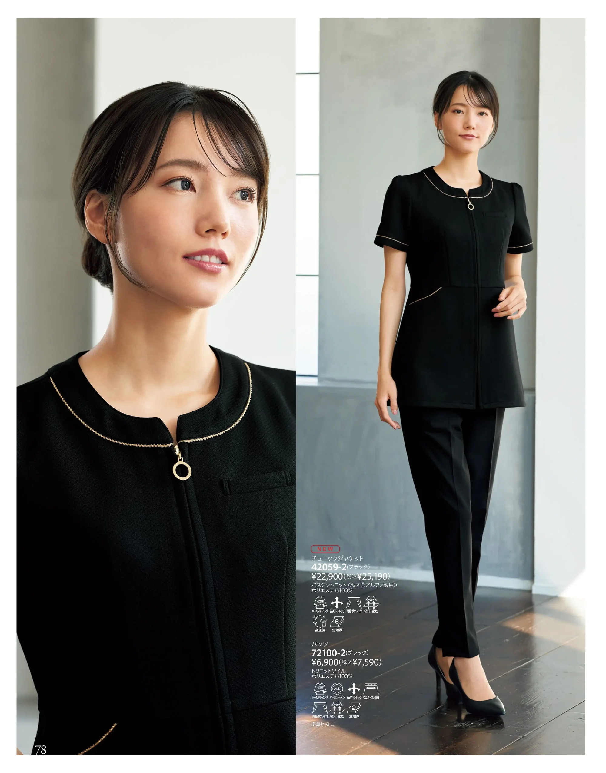 LA BEAUTE COLLECTIONのチュニックジャケット。セオアルファ使用のポリエステル100%バスケットニットと2WAYストレッチにより美しいシルエットと快適な着心地を実現。ブラックとゴールドのコントラストがワンランク上の洗練された印象を演出します。