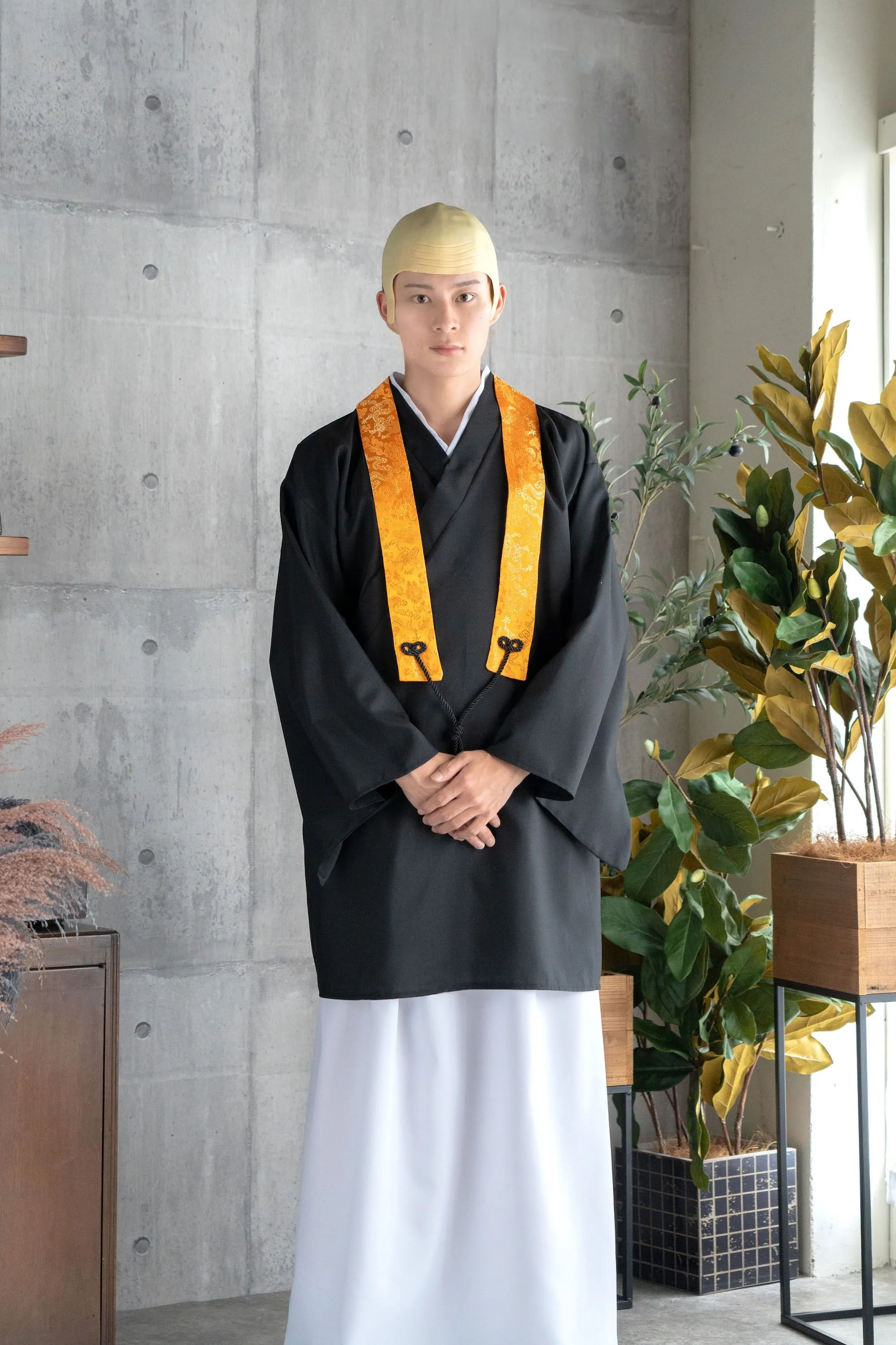 かっこいい系からおふざけ系まで豊富なラインナップが揃う「MEMコス」シリーズ!お坊さんは半袈裟付きで本格的な作りになっています。着物は被りで着用できる仕様で着崩れしにくく、袴風スカートはウエストゴムではきやすいです。市販の坊主ウィッグを付けると更に本格的なお坊さんに!