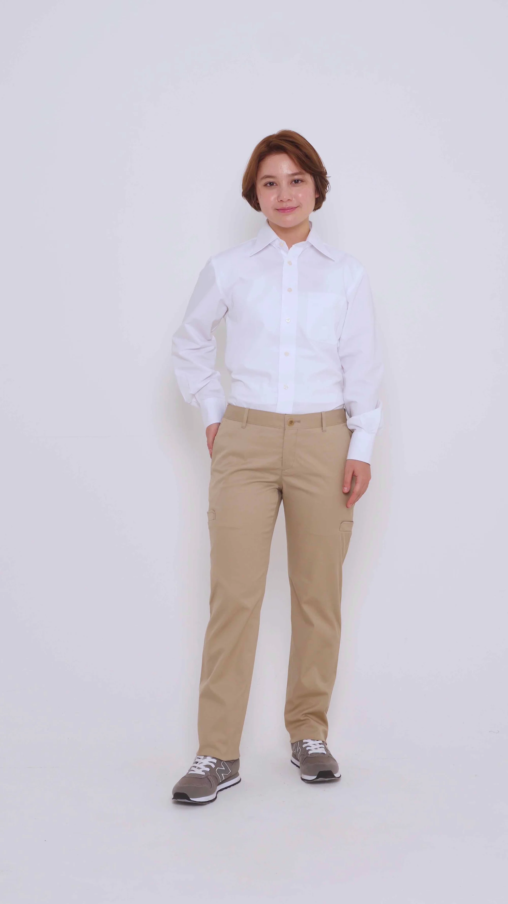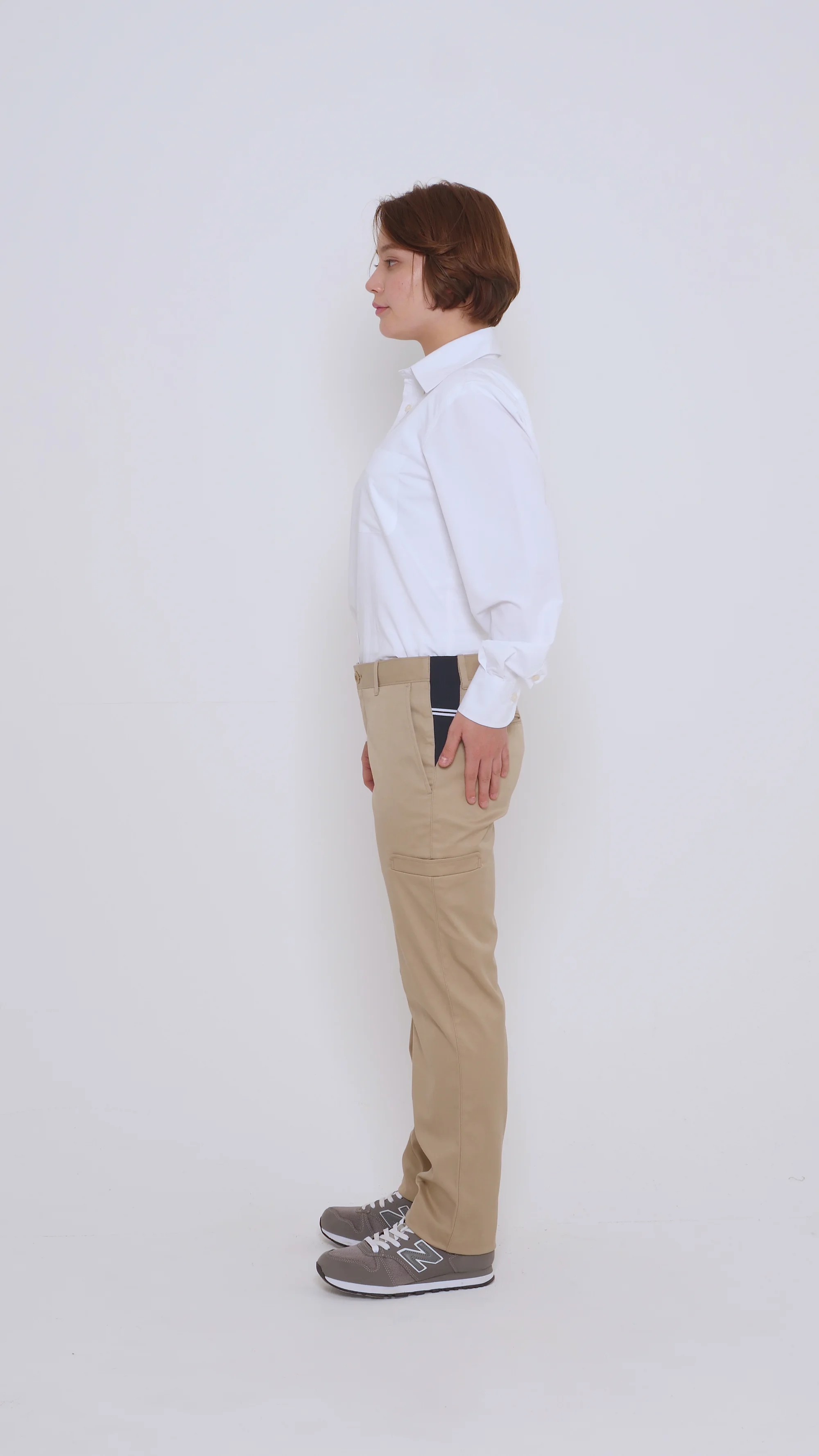美脚シルエットが魅力の快適リブ仕様のレディスチノ! 左右と後ろ2ヶ所ずつのポケット裏地には、ストライプ柄のスレキを使用。