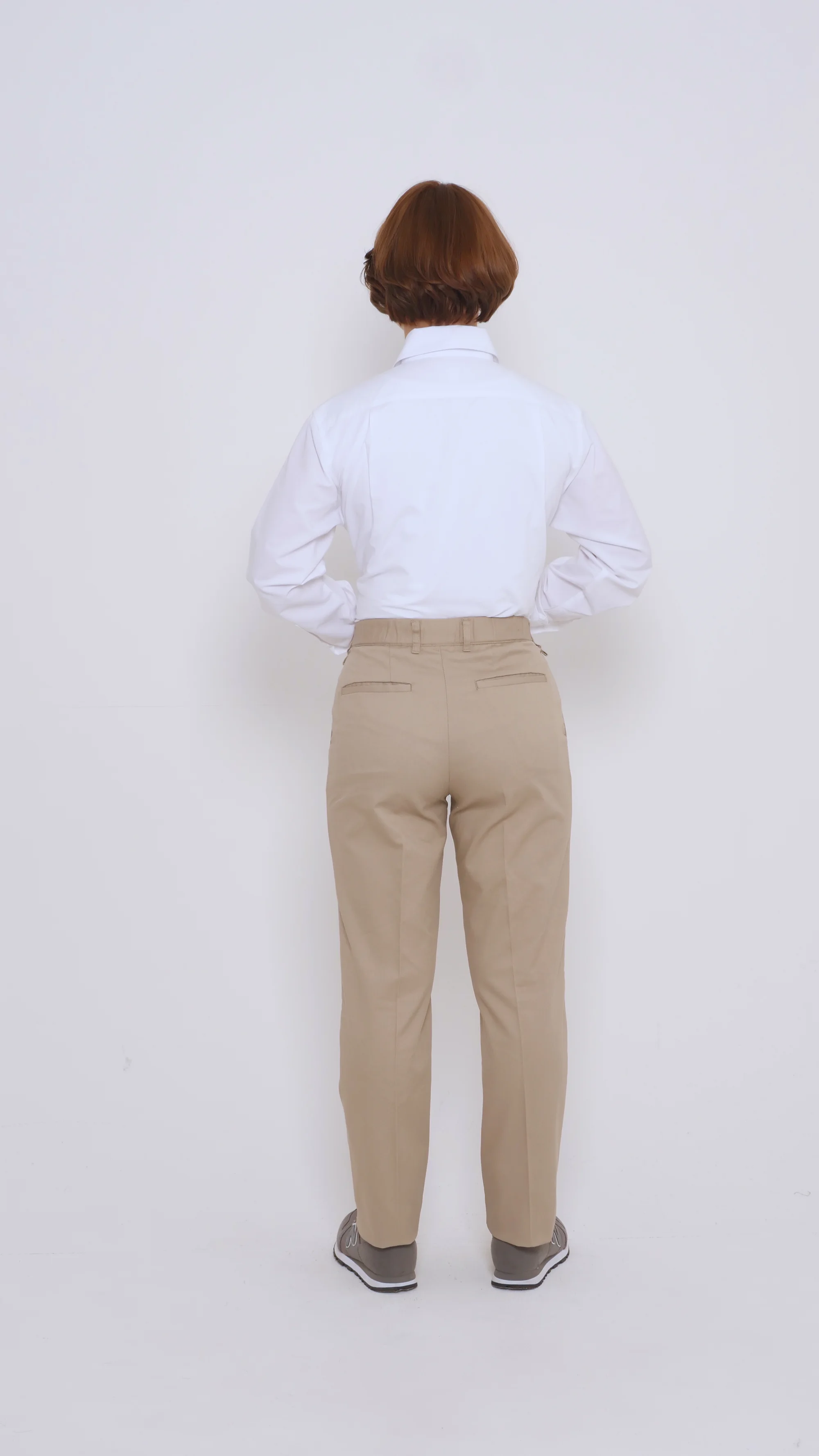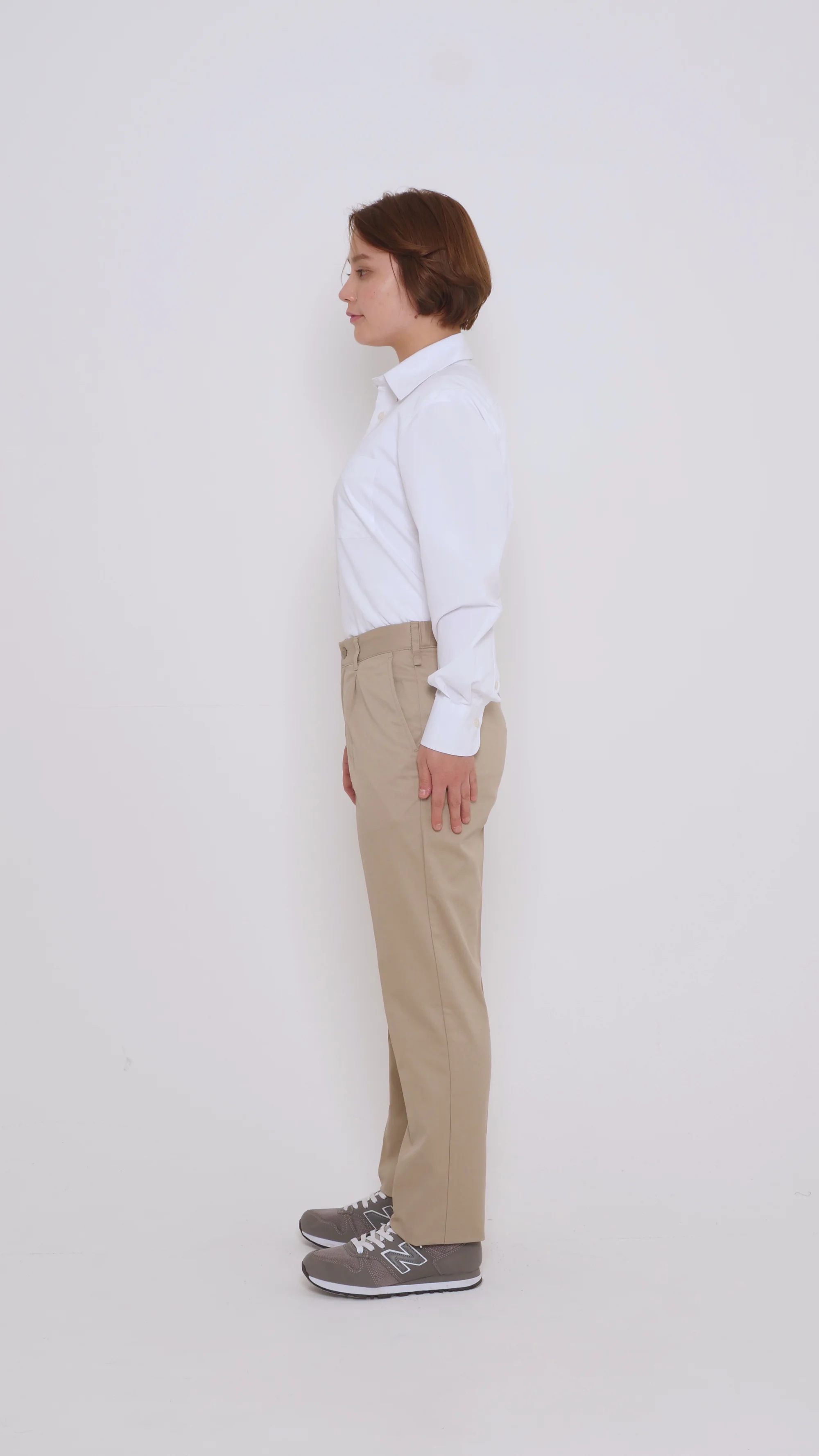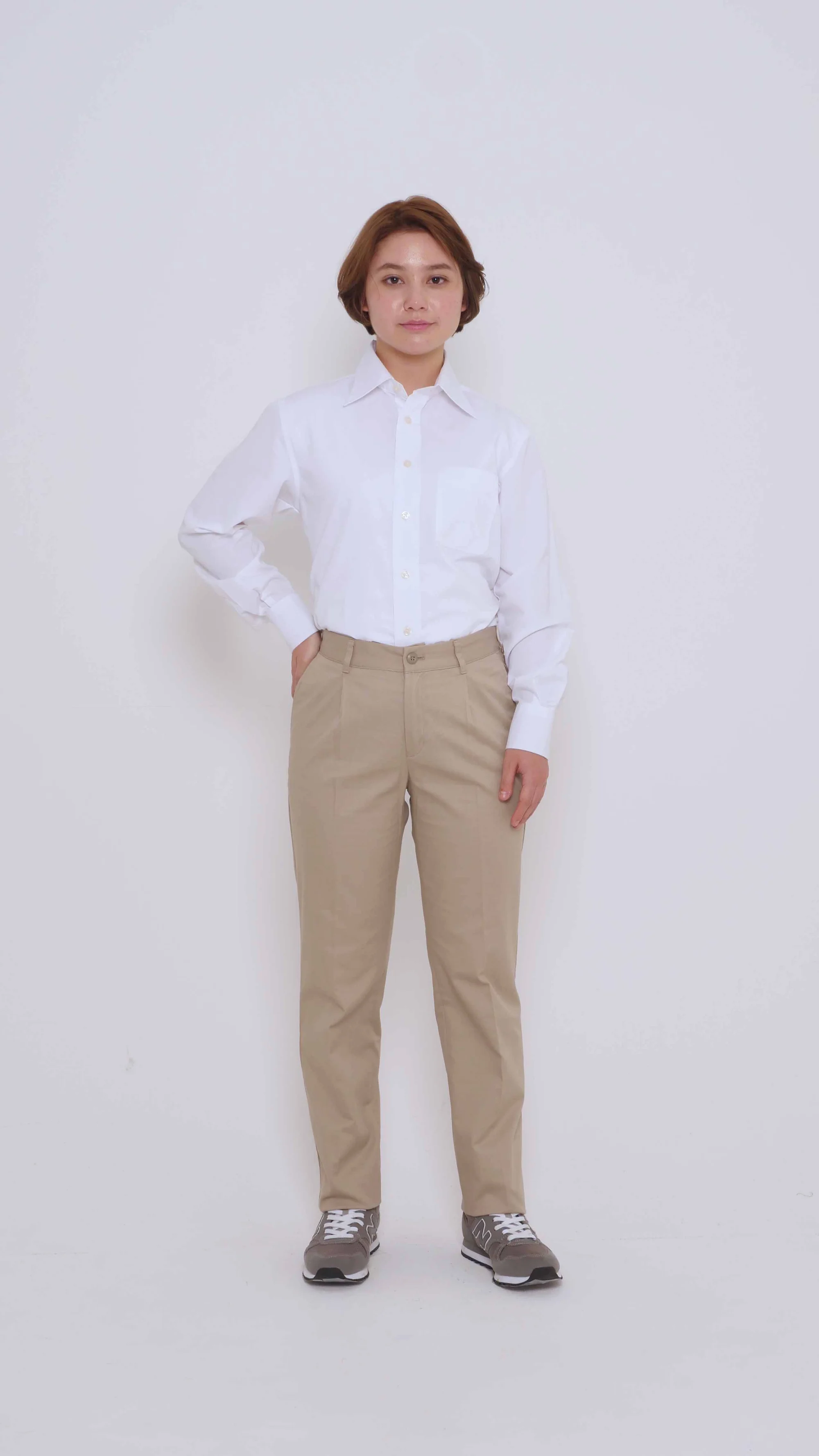 余裕のある穿き心地で快適度アップ!ゆったりシルエットのレディスチノ。フロントには、すっきりとしたワンタックを採用。ゆとりあるシルエットになっています。両脇には使いやすい斜めポケットを配置しています。小物の出し入れなどに便利。後ろウエストは総ゴム仕様に。ストレスフリーで、ゆったりとした穿き心地を実現。後ろ両側には、片玉縁ポケットを配置しています。耐久性に優れたデザインを採用。両腰後左右のベルトループには、カギや小物を吊り下げるのに便利な輪っか付です。