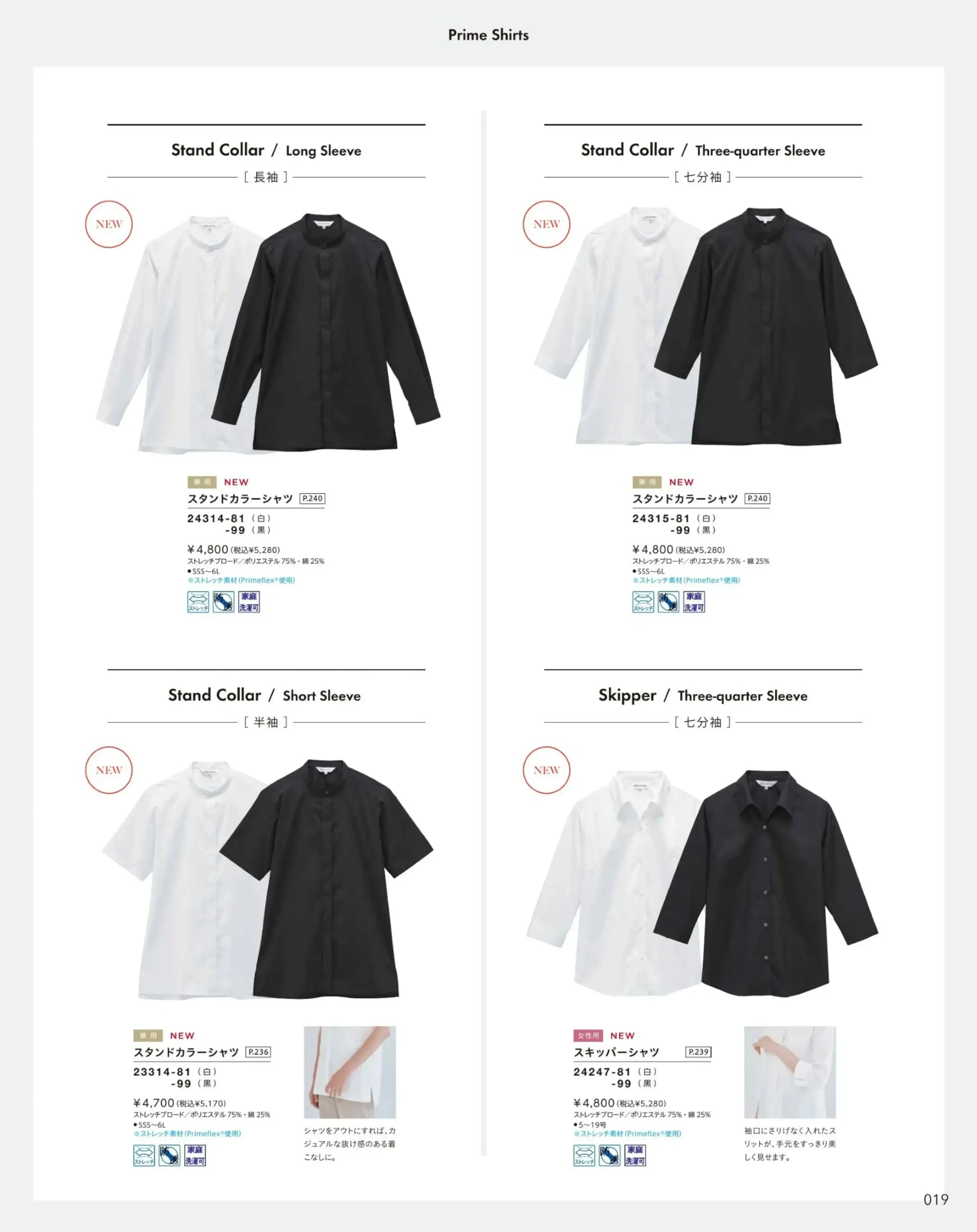上品で清潔感のある印象を演出するスタンドカラーシャツ七分袖。Primeflex®使用ストレッチブロード素材を採用し、ポリエステル75%・綿25%。動きやすさときちんと感を両立し、接客・サービス・オフィスユニフォームに幅広く対応します。