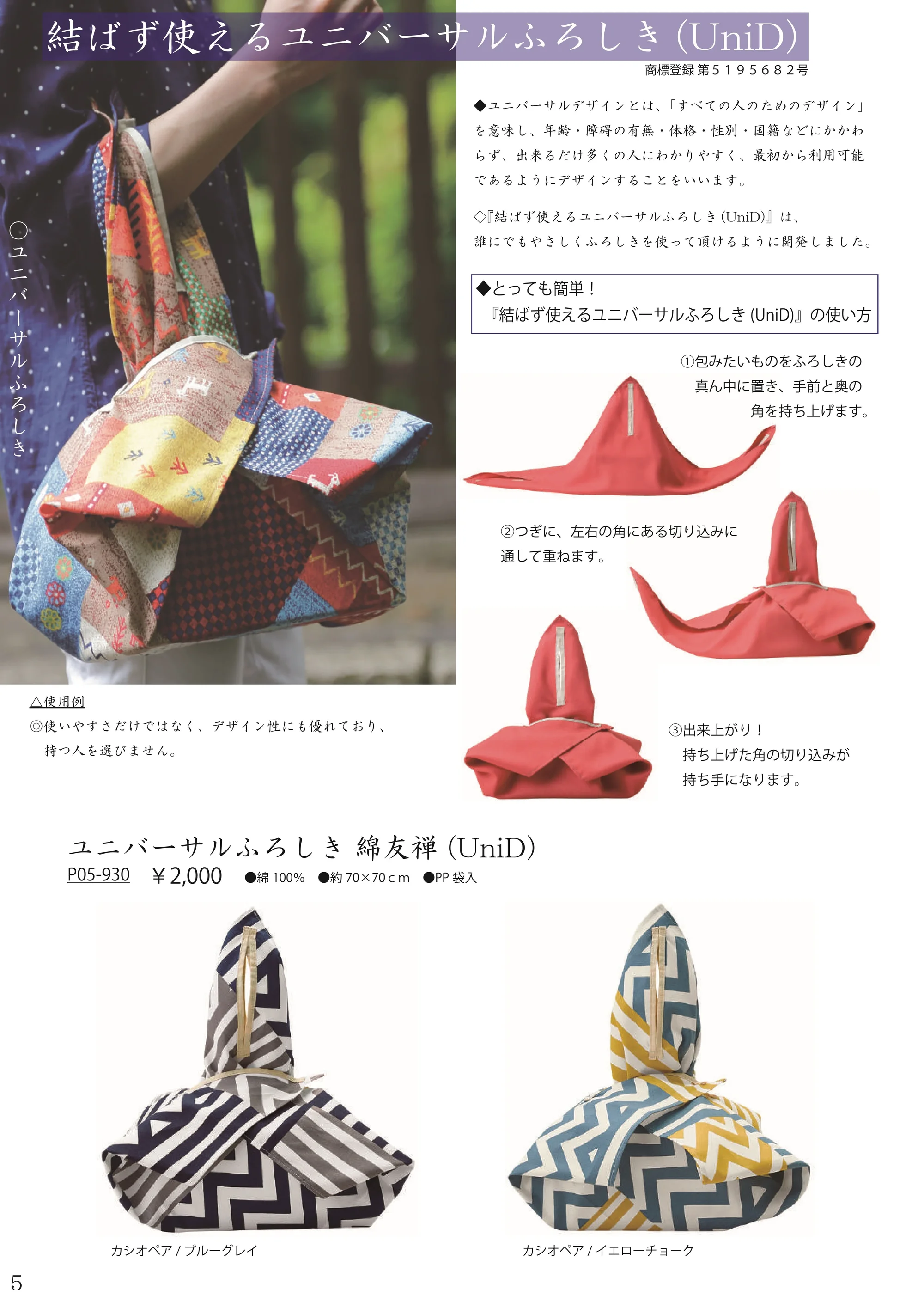 「結ばず使えるユニバーサルふろしき(UniD)」は、この考えのもとに、結ぶことが難しい人にもやさしくふろしきの使い心地を知っていただけるように開発しました。