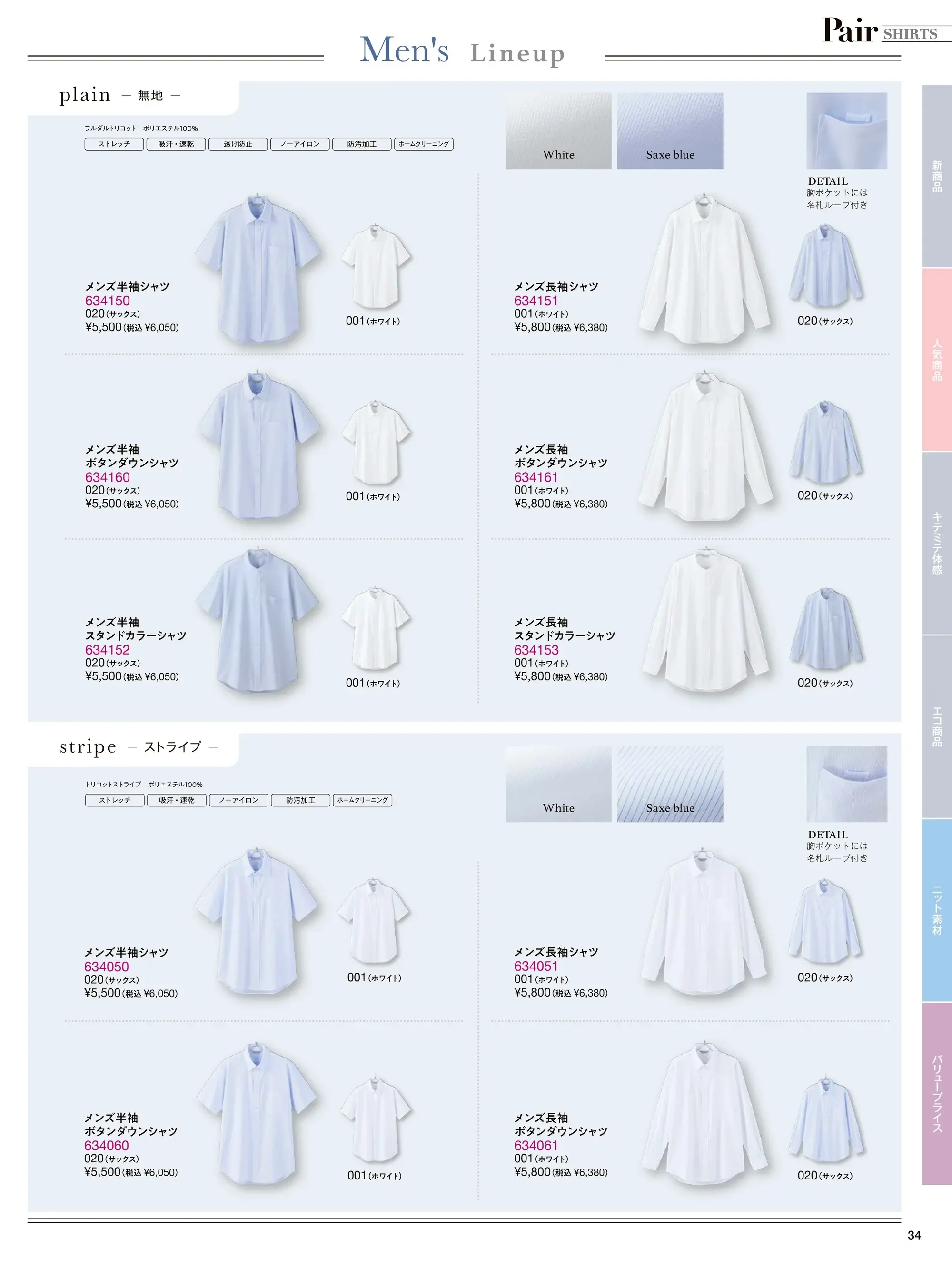| 素材特長 | 吸汗速乾・ストレッチ・ノーアイロン・防汚加工・透け防止・ホームクリーニング |