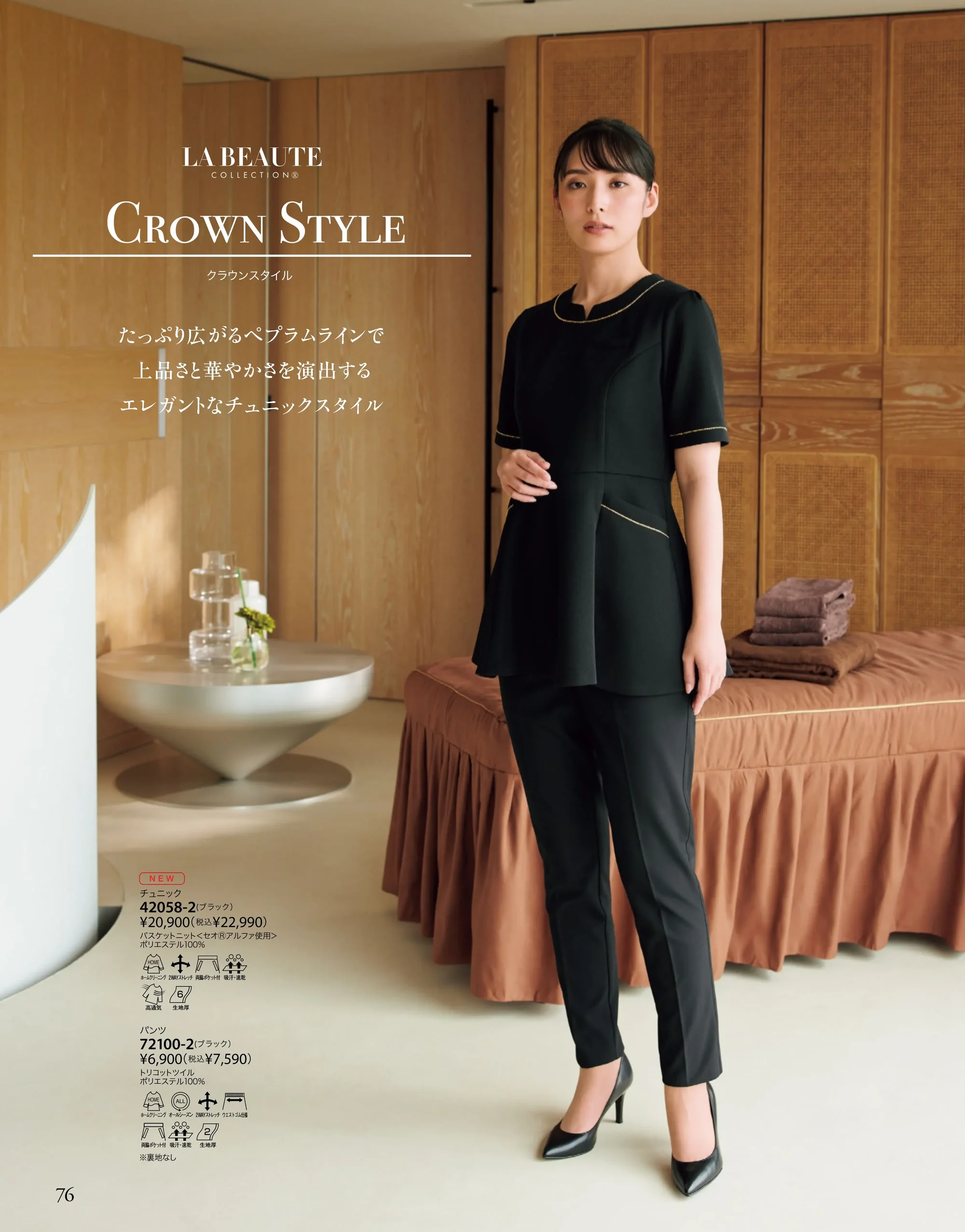 LA BEAUTE COLLECTIONのエレガントチュニック。セオアルファ採用のポリエステル100%バスケットニットと2WAYストレッチで軽やかな動きやすさを実現。ペプラムラインが美しいシルエットを作り上げ上質で華やかな接客スタイルを叶えます。