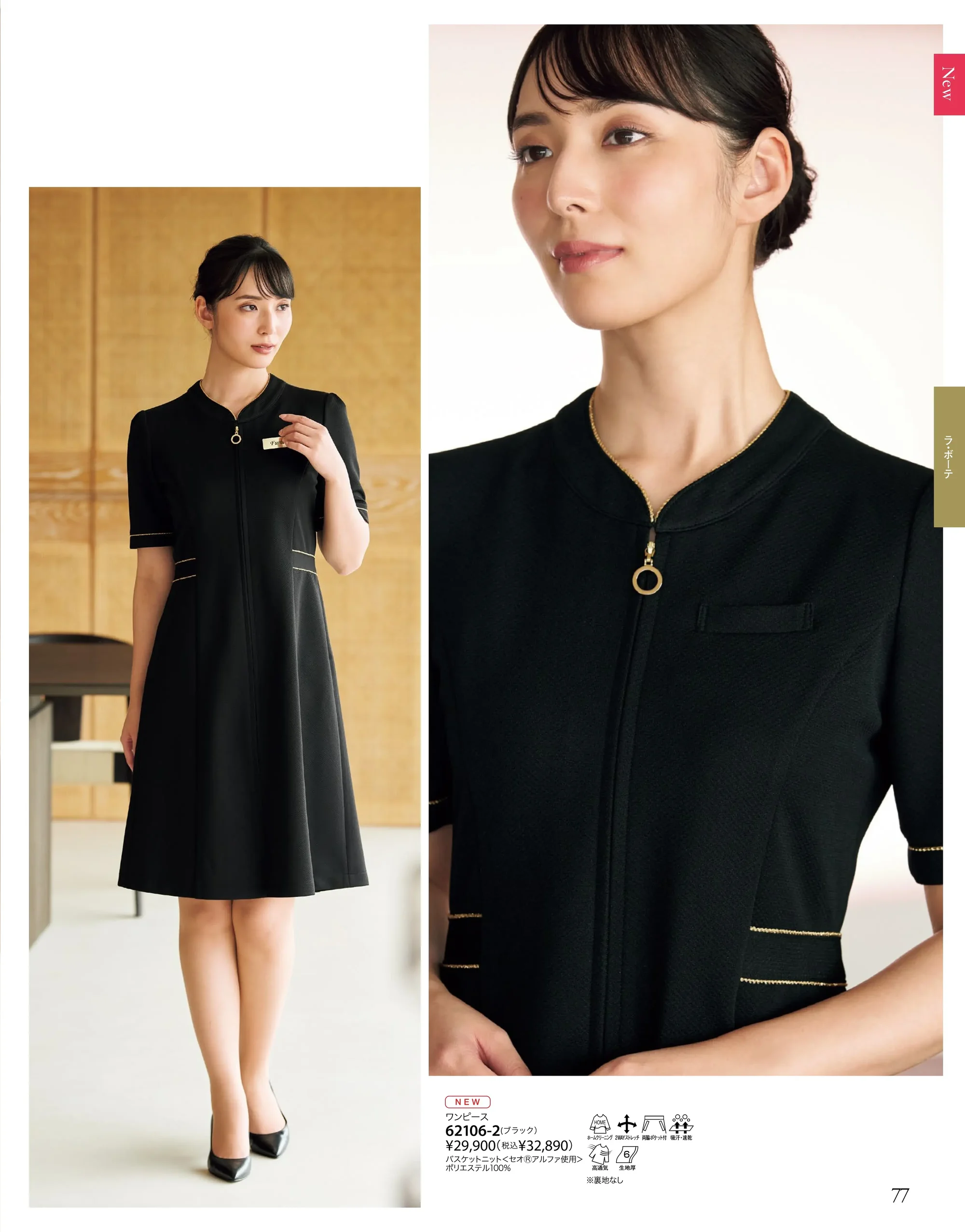 LA BEAUTE COLLECTIONの美容医療向けワンピース。セオアルファ使用のポリエステル100%バスケットニットと2WAYストレッチにより動きやすさと上質感を両立。ペプラムラインとブラック×ゴールドの配色が立体的な美シルエットを演出し上品で信頼感のある印象を高めます。