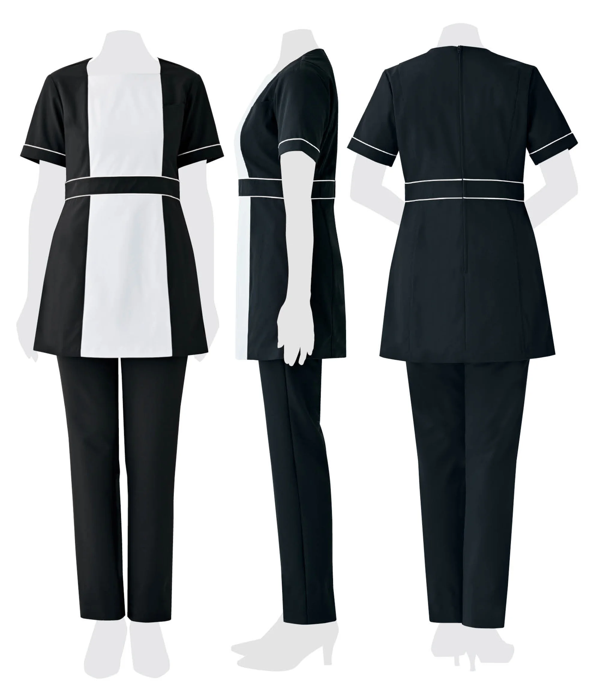 | 形状特長 | 左胸・両脇ポケット、後ろファスナー開き、高めの位置のウエストパイピング、袖口パイピング |
