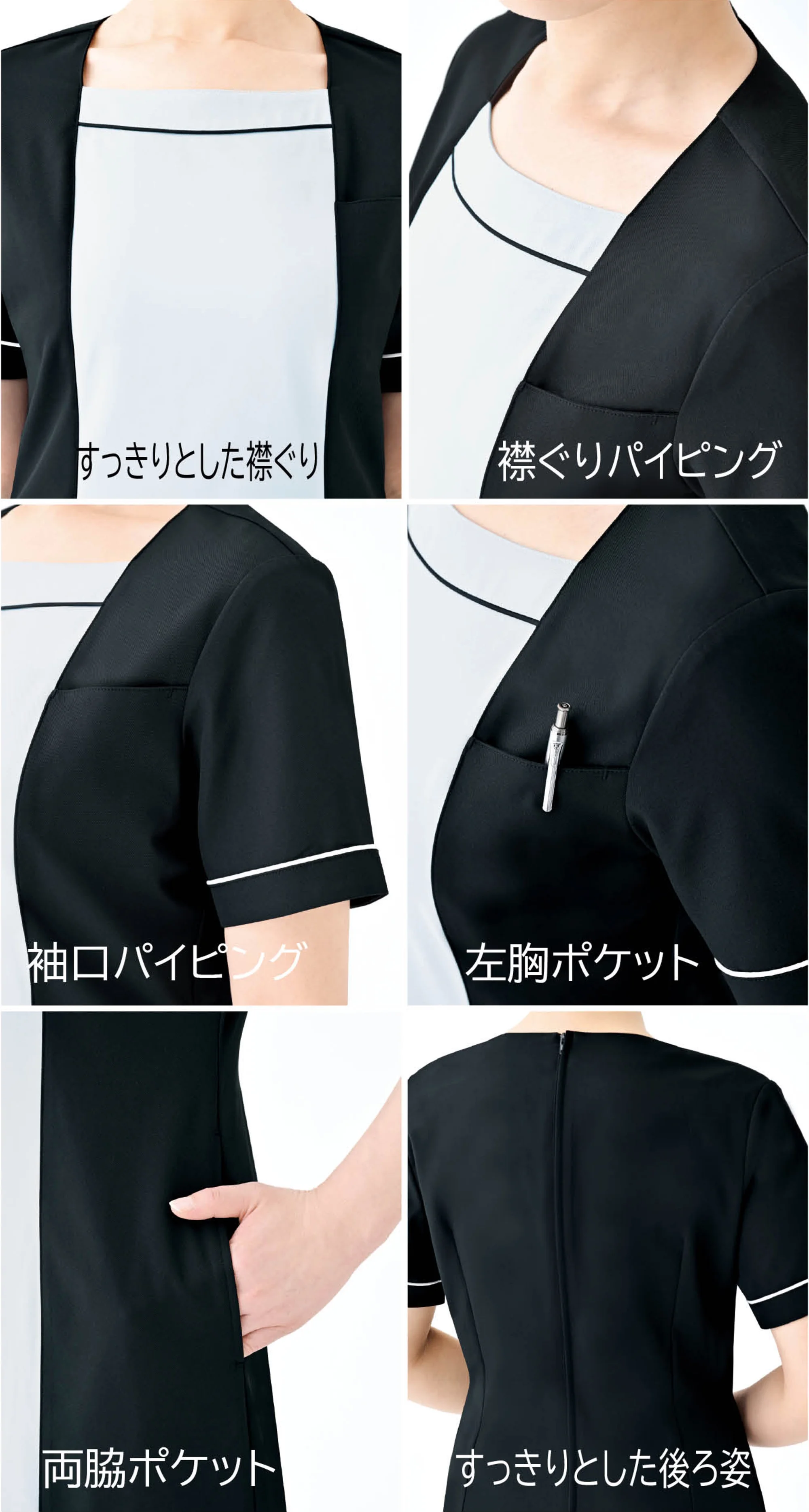 | 形状特長 | 左胸・両脇ポケット、後ろファスナー開き、襟ぐりパイピング、袖口パイピング |