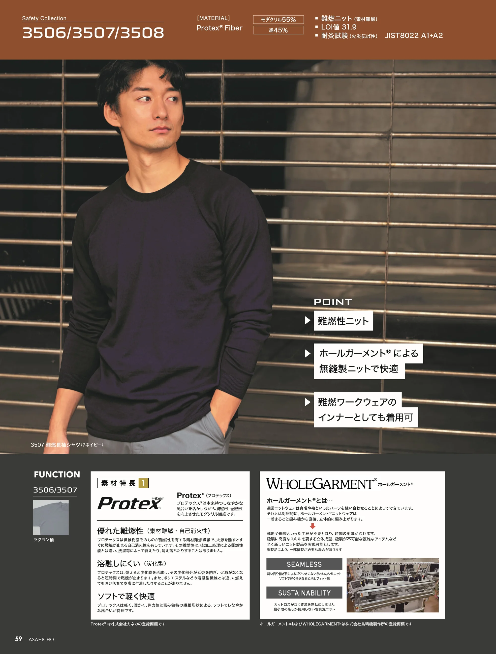 高機能難燃素材Protex® Fiberを使用したホールガーメント仕様の難燃バラクラバです。モダクリル55%・綿45%の難燃ニット素材により高い耐熱性と快適な着用感を両立。無縫製の立体編み構造で肌当たりがやさしく、口元は呼吸しやすい編地設計を採用。JIS T8022 A1+A2相当の耐炎性能を備えています。