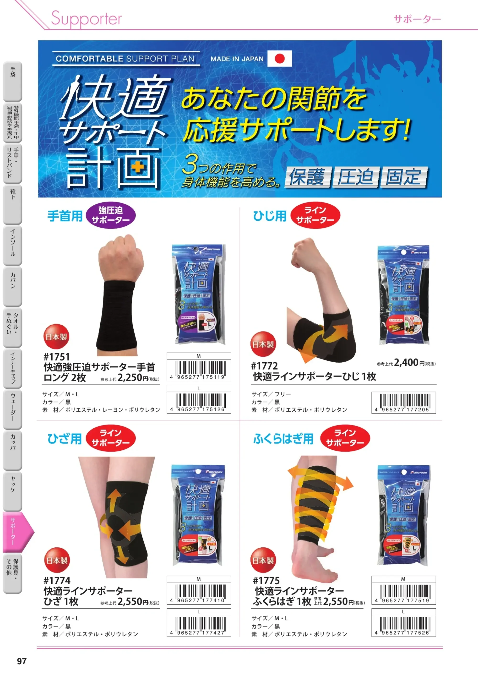作業が楽になるサポーター「快適計画」計画シリーズ。「快適計画」は、スポーツサポーターのトップメーカーD&Mとの共同企画商品です。働く人にとって負担のかかる部分を適度な圧迫力でしっかりガードします。