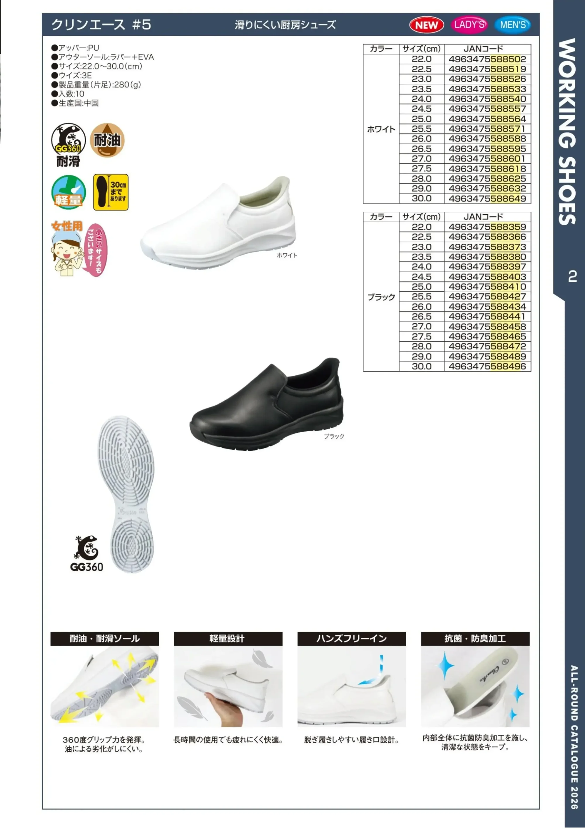| 素材特長 | 耐滑(GG360ソール) 耐油 軽量 抗菌防臭 |
