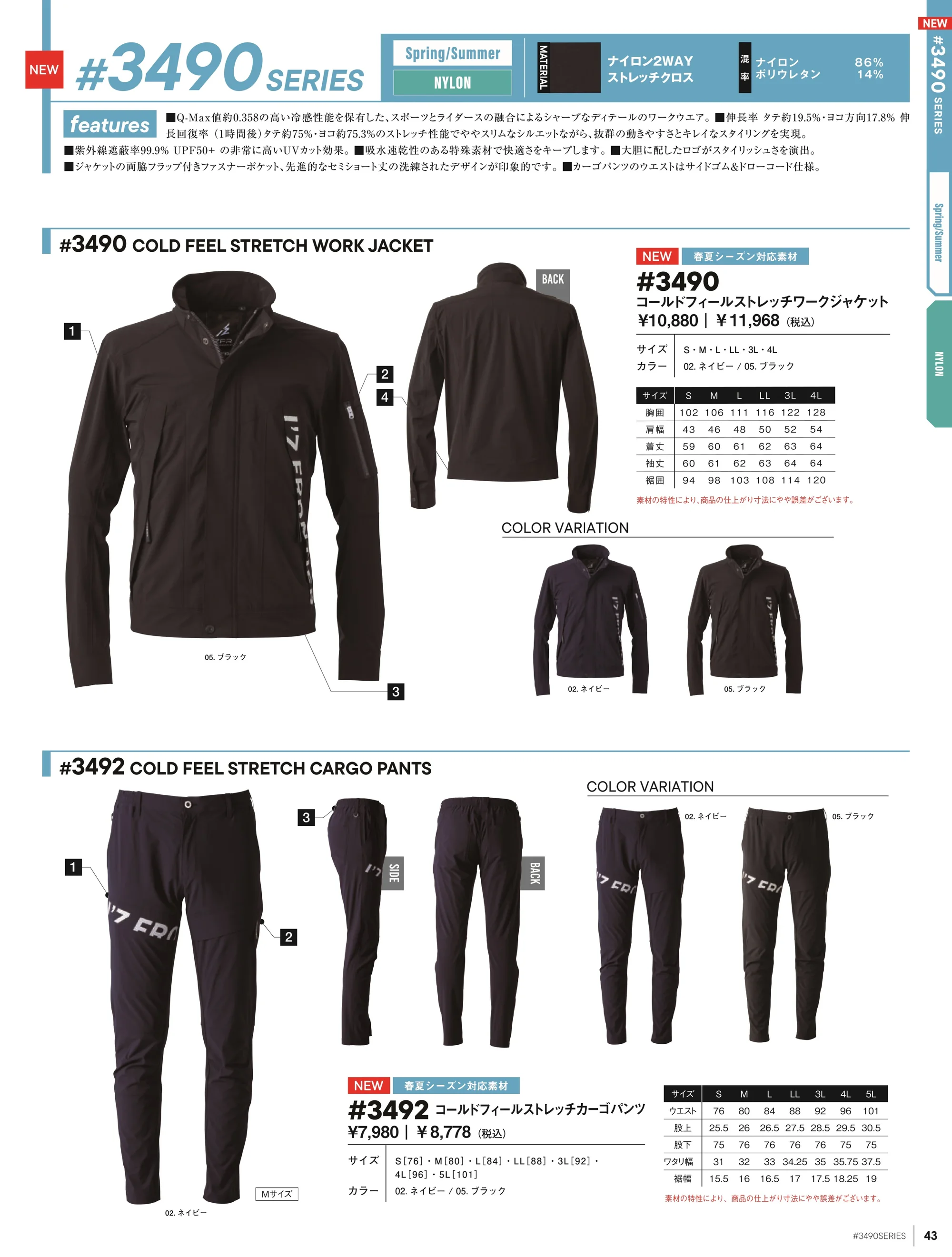 接触冷感性能を示すQ-max値0.358を誇るナイロン2WAYストレッチクロスを採用した、スポーツとライダースの要素を融合したシャープなデザインのワークジャケット。ナイロン86%ポリウレタン14%の高機能素材により、タテ約19.5%ヨコ約17.8%のストレッチ性と優れた伸長回復率を実現。UVカット率約99.9%で、暑さと紫外線を軽減しながら快適な作業環境をサポートします。