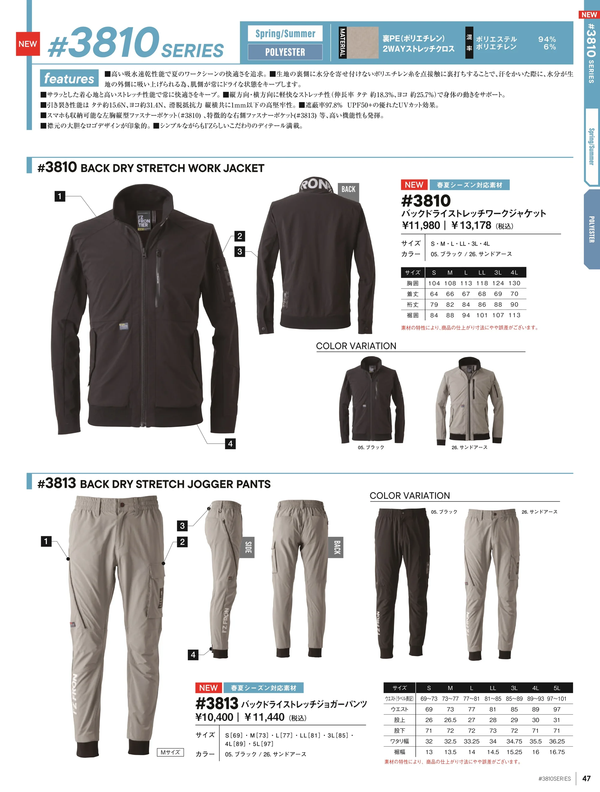 春夏シーズンに最適な3810シリーズのバックドライストレッチジョガーパンツ。ポリエステル94%・ポリエチレン6%の2WAYストレッチ素材で伸長率タテ約18.3%ヨコ約25.7%を実現し、軽やかな動きやすさを発揮。裏面のバックドライ構造により汗を外へ逃がし、蒸れにくく快適な履き心地をキープします。