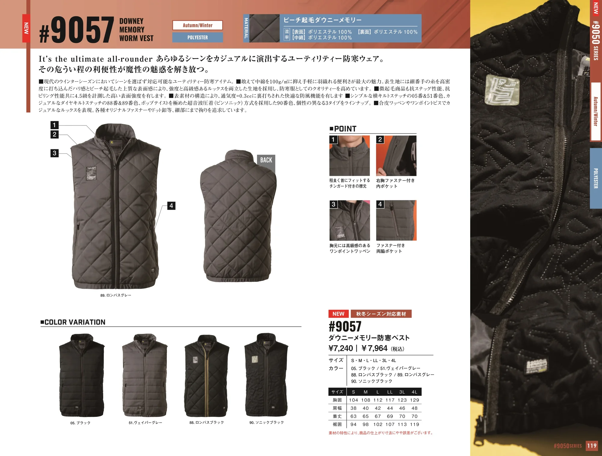 形状特長 | 05、51番色 横キルトステッチ 88、89番色 ダイヤキルトステッチ 90番色 超音波圧着ピンソニック仕様 右胸ファスナー付き内ポケット 両脇ファスナー付ポケット チンガード付き襟元 |