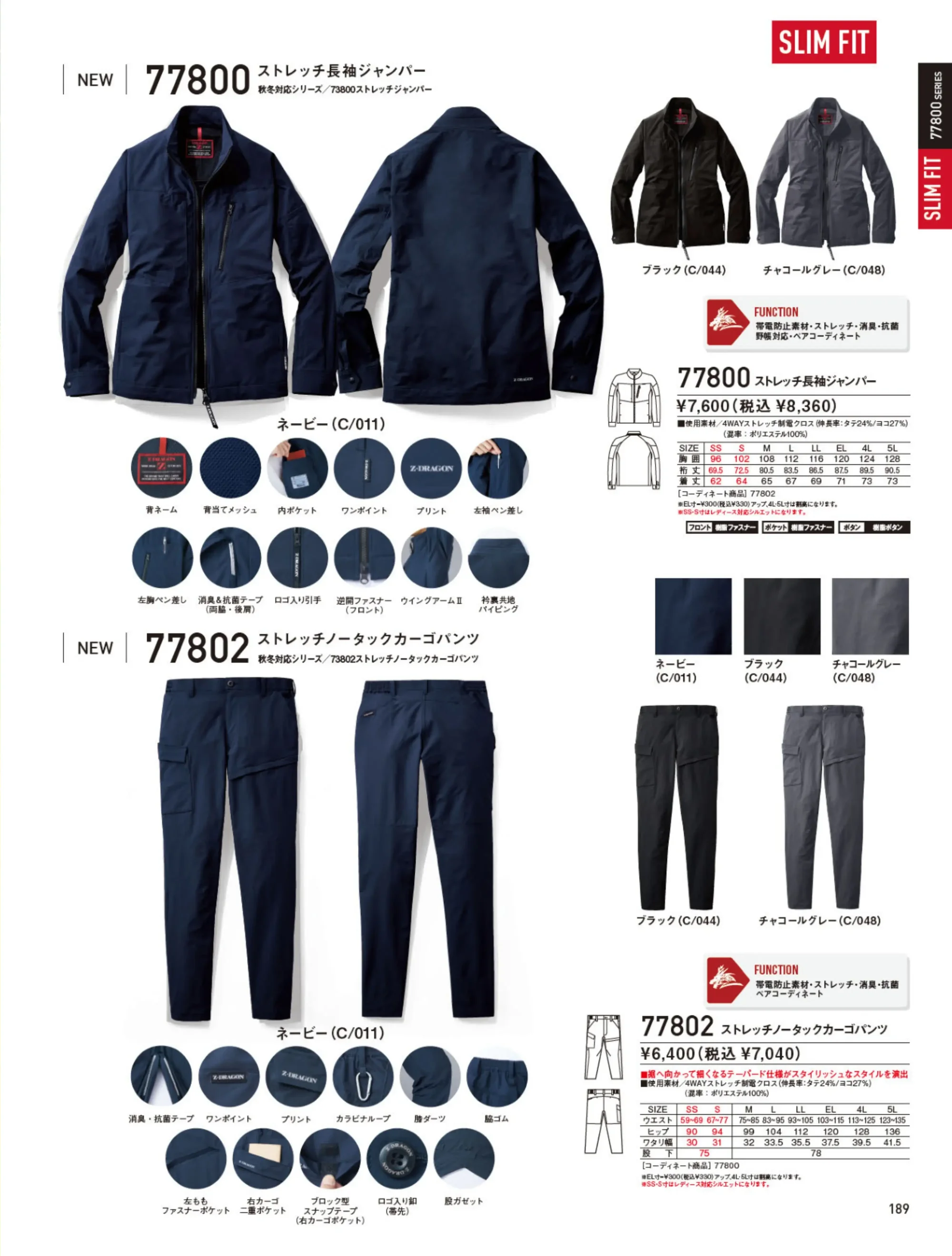 | 素材特長 | 4WAYストレッチ(伸長率タテ24%・ヨコ27%)|帯電防止|消臭・抗菌|樹脂パーツ |