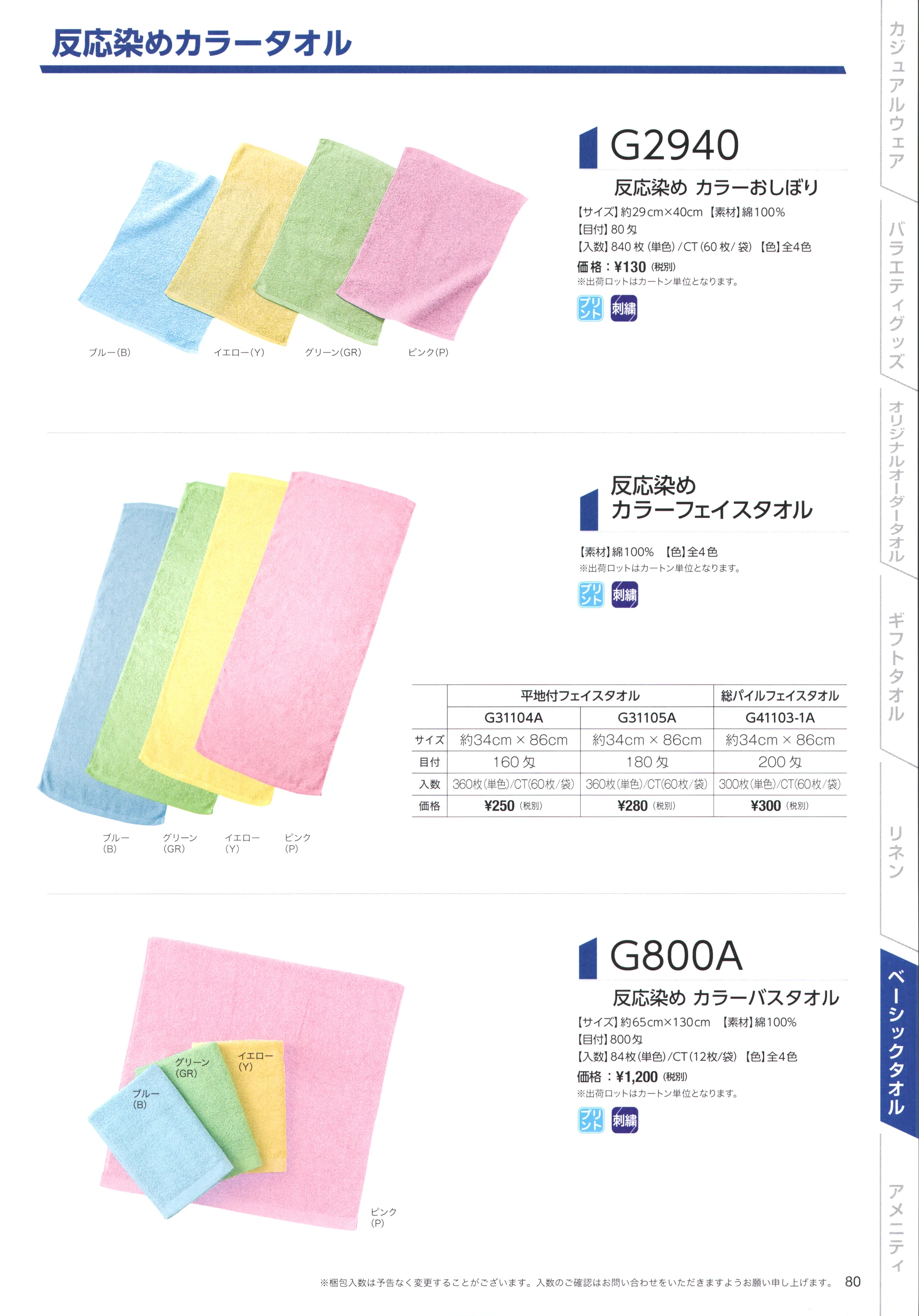 G31105A 平地付カラーフェイスタオル(180匁/360枚入り)
