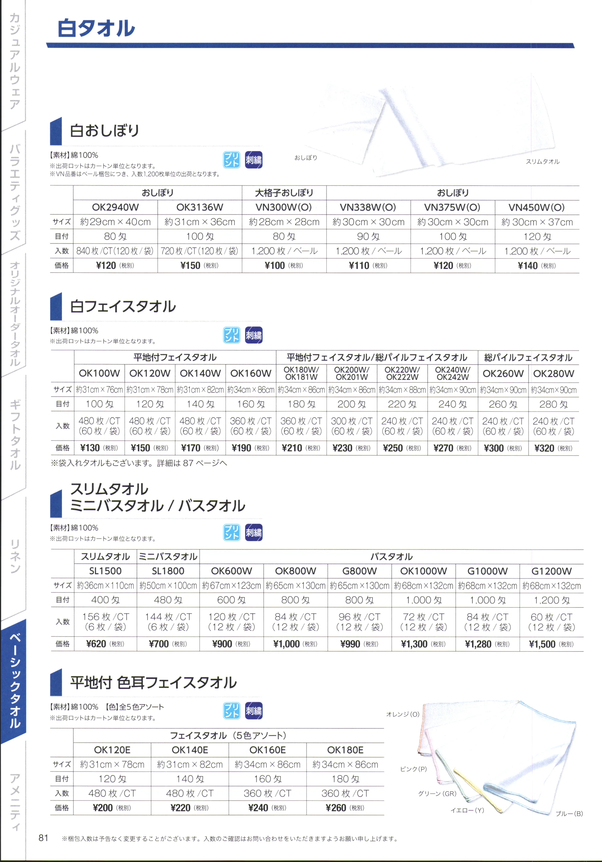 OK180W 平地付白フェイスタオル(180匁/360枚入)
