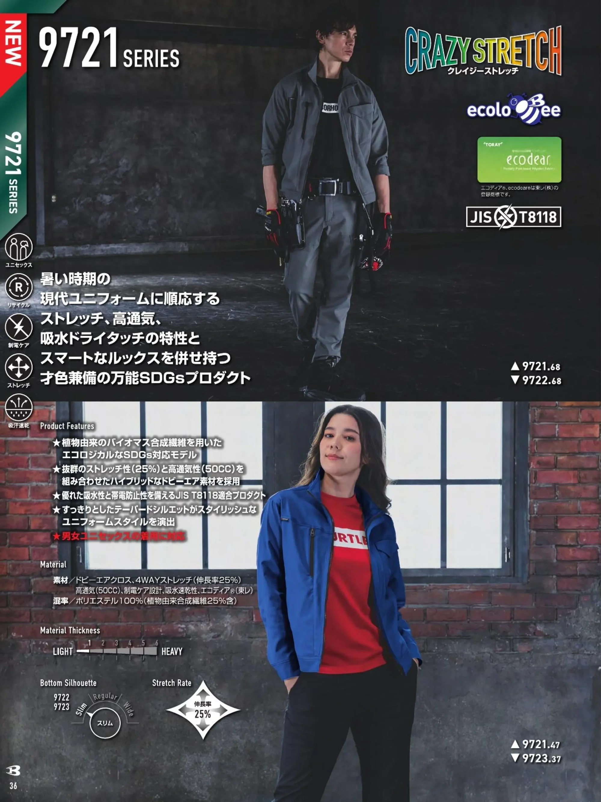 CRAZY STRETCHシリーズのユニセックス対応パンツ9723。4WAYストレッチ伸長率25%と高通気性50CCを備えたドビーエアクロス素材を採用し、JIS T8118適合の制電性能も装備。吸水ドライタッチで暑い季節も快適に、すっきりとしたスリムシルエットでスマートなワークスタイルを実現します。