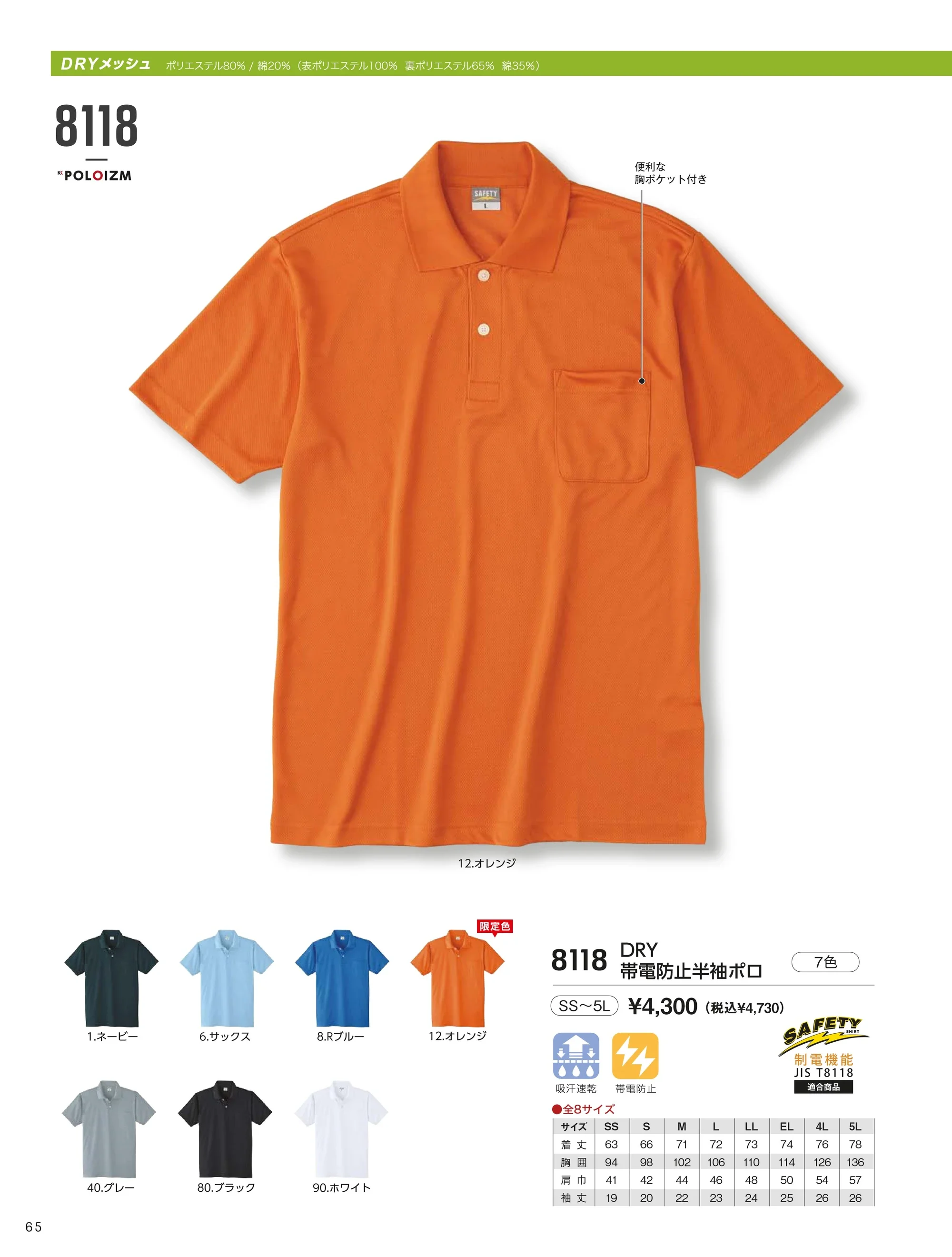| 形状特長 | 胸ポケット付き。便利な胸ポケット付きで仕事をサポートします。 SS~5Lの豊富なサイズ展開。 |