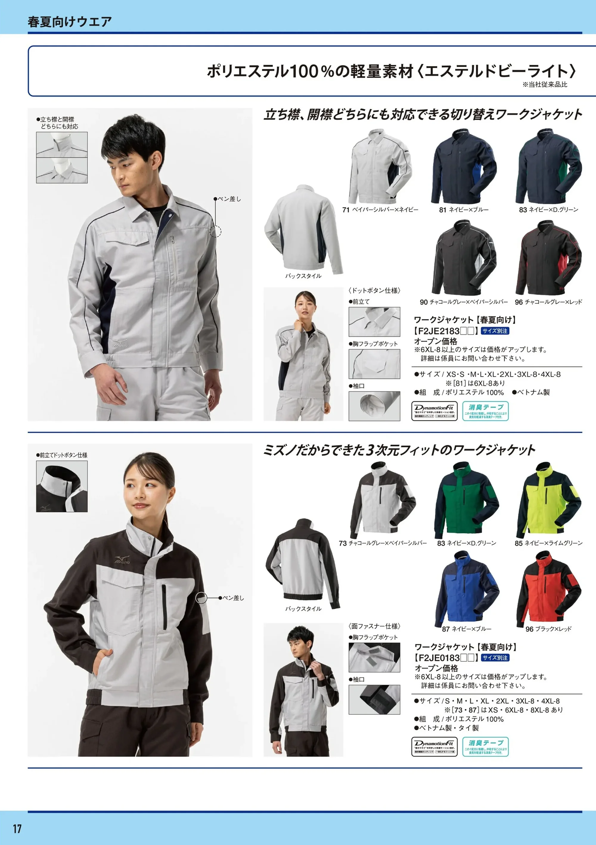 ミズノが提案する春夏向けの軽量ワークジャケット。ポリエステル100%の〈エステルドビーライト〉素材を採用し、軽くて動きやすく、制電性にも優れています。立ち襟・開襟どちらにも対応できるデザインで、現場でもスタイリッシュに着こなせます。