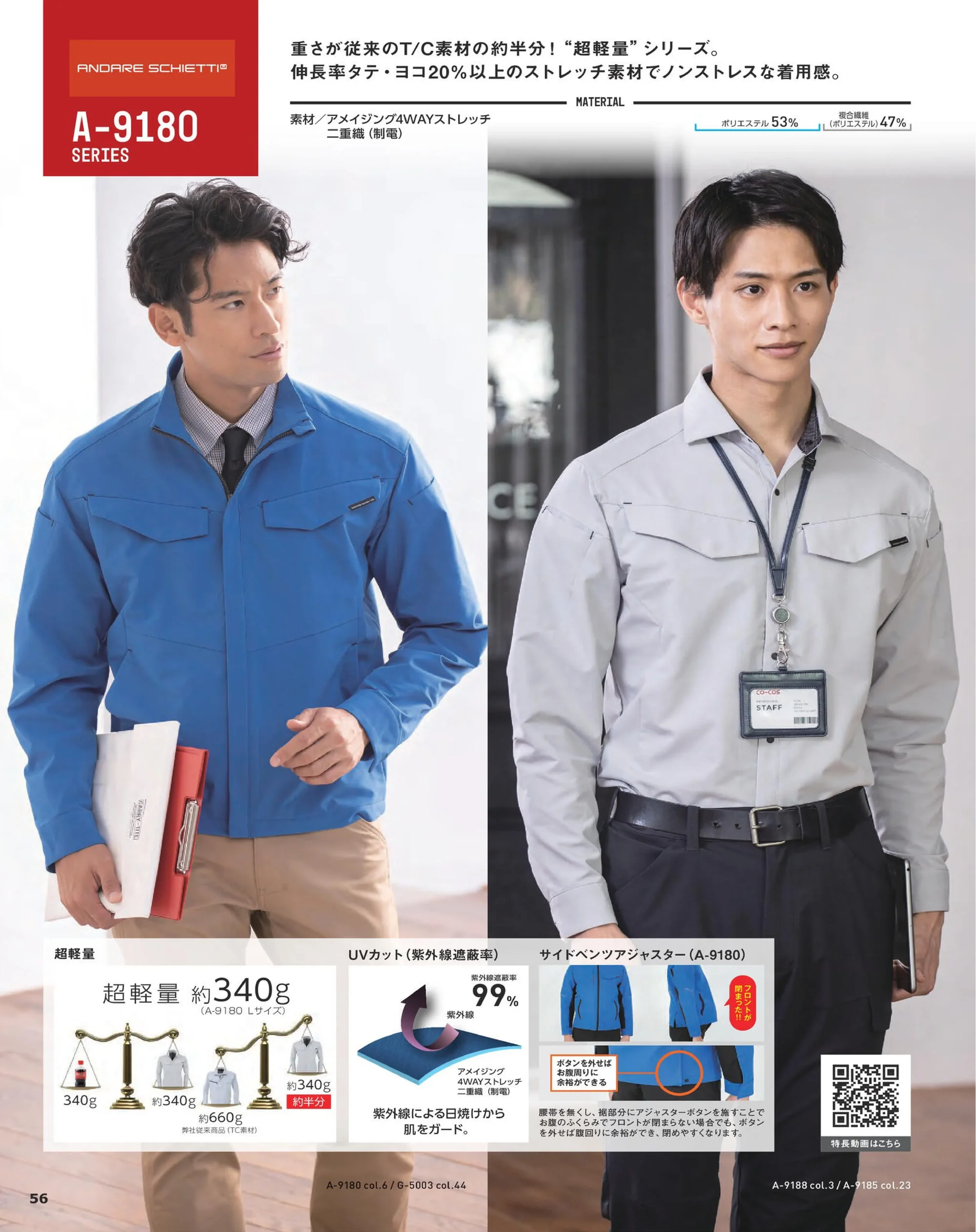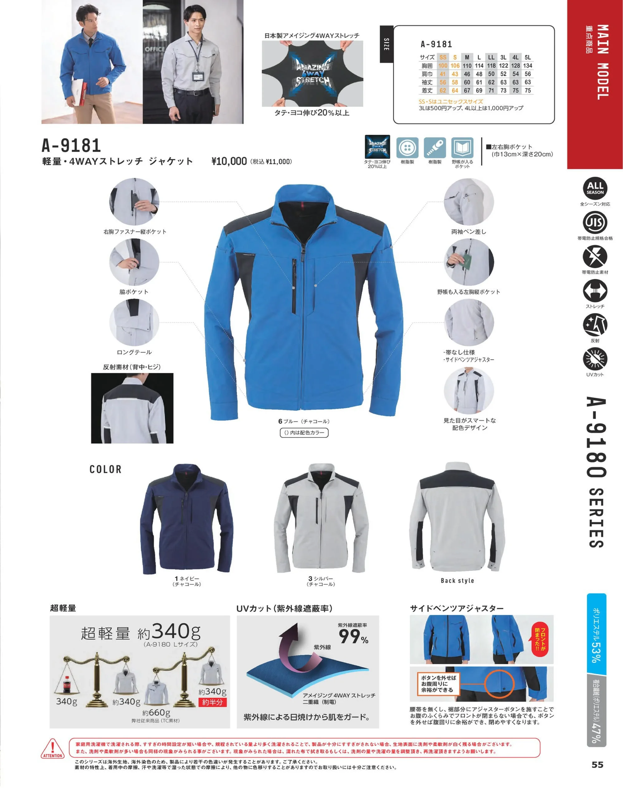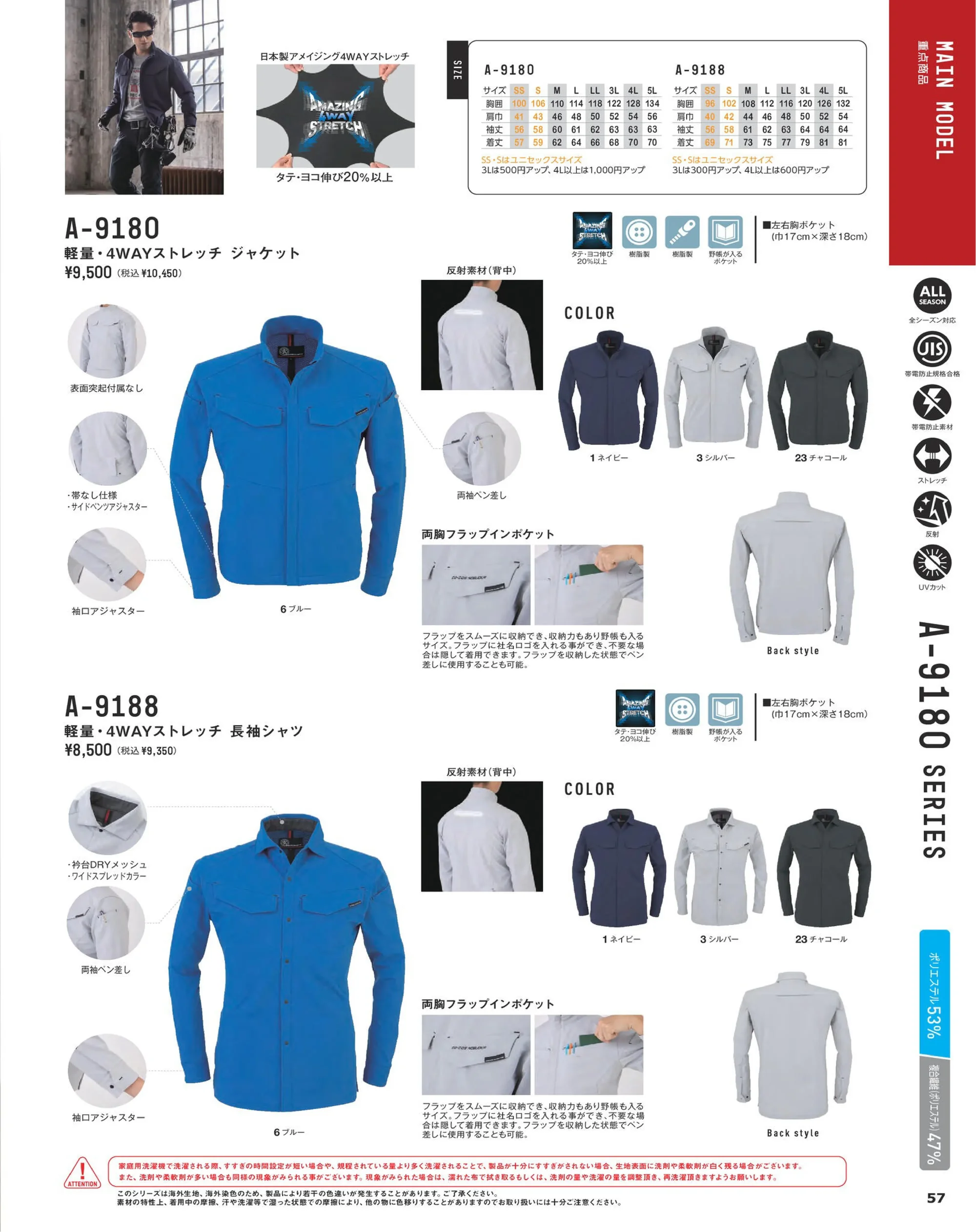 | 使用素材 | アメイジング4WAYストレッチ二重織(制電)ポリエステル53%・複合繊維(ポリエステル)47% |