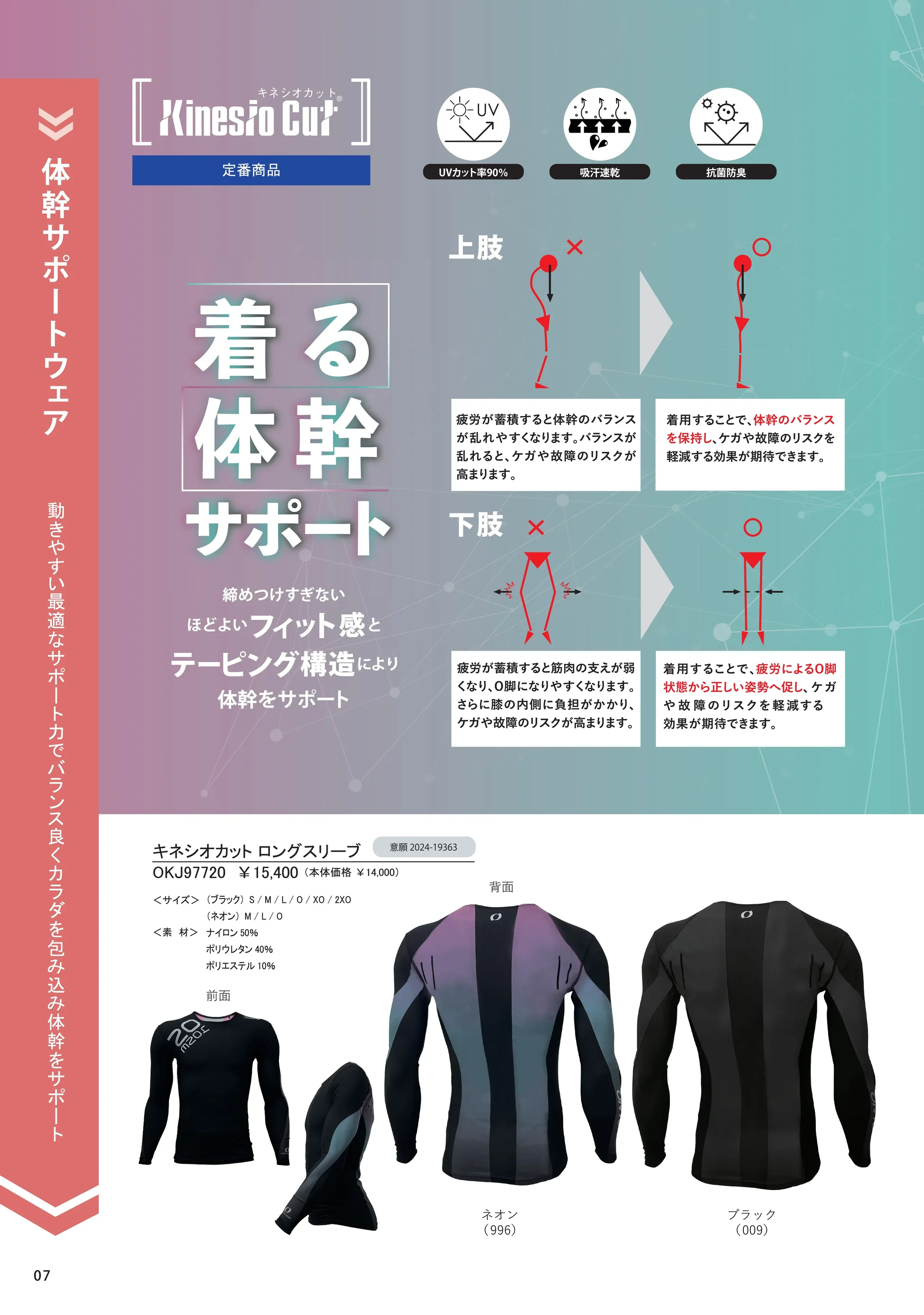 サポート部分の伸縮性を抑えたテーピング構造により体幹のバランスを保持。着用することで正しい姿勢へと促します。