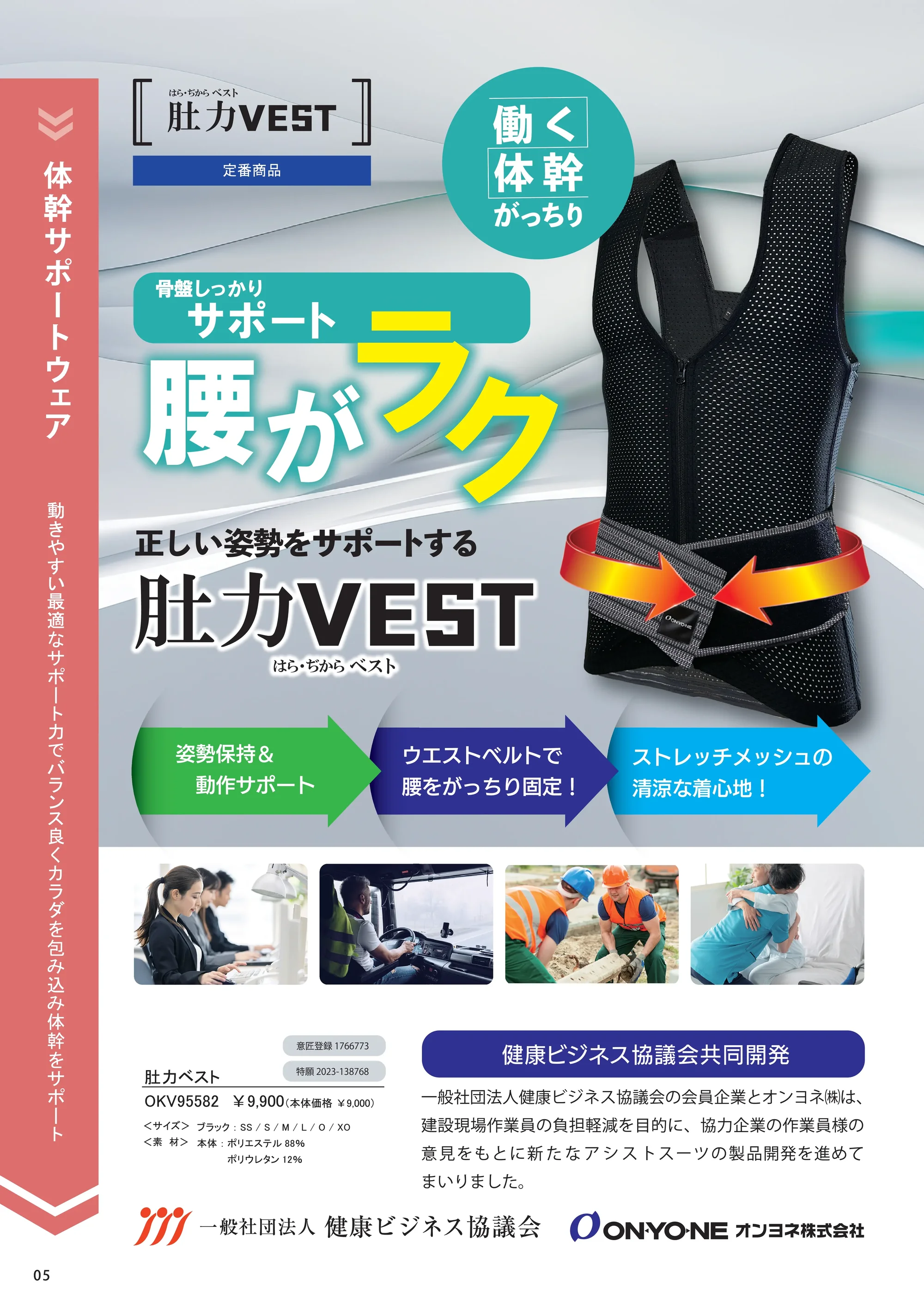 正しい姿勢をサポートし、腰への負担を軽減する肚力(はらぢから)VEST。ウエストベルトでしっかり固定しながら、ストレッチメッシュ素材で清涼感のある着心地を実現。体幹を安定させ、長時間の立ち仕事や持ち上げ動作をラクにします。