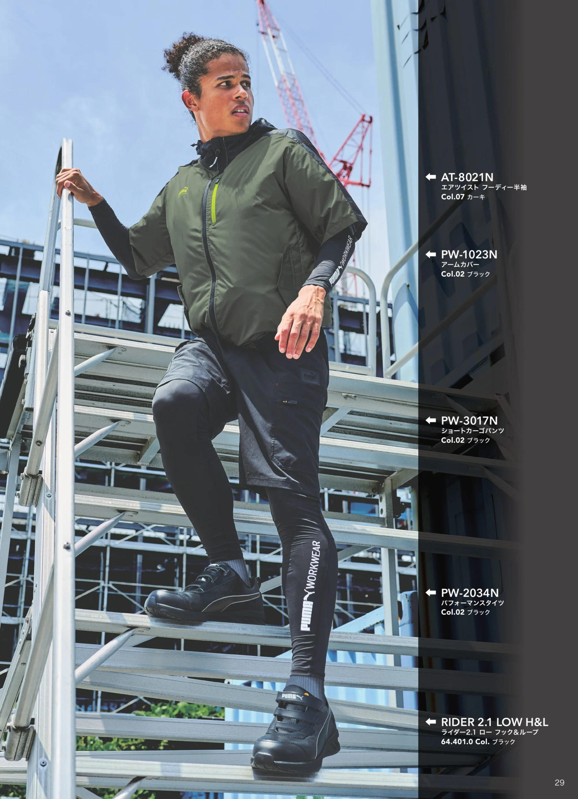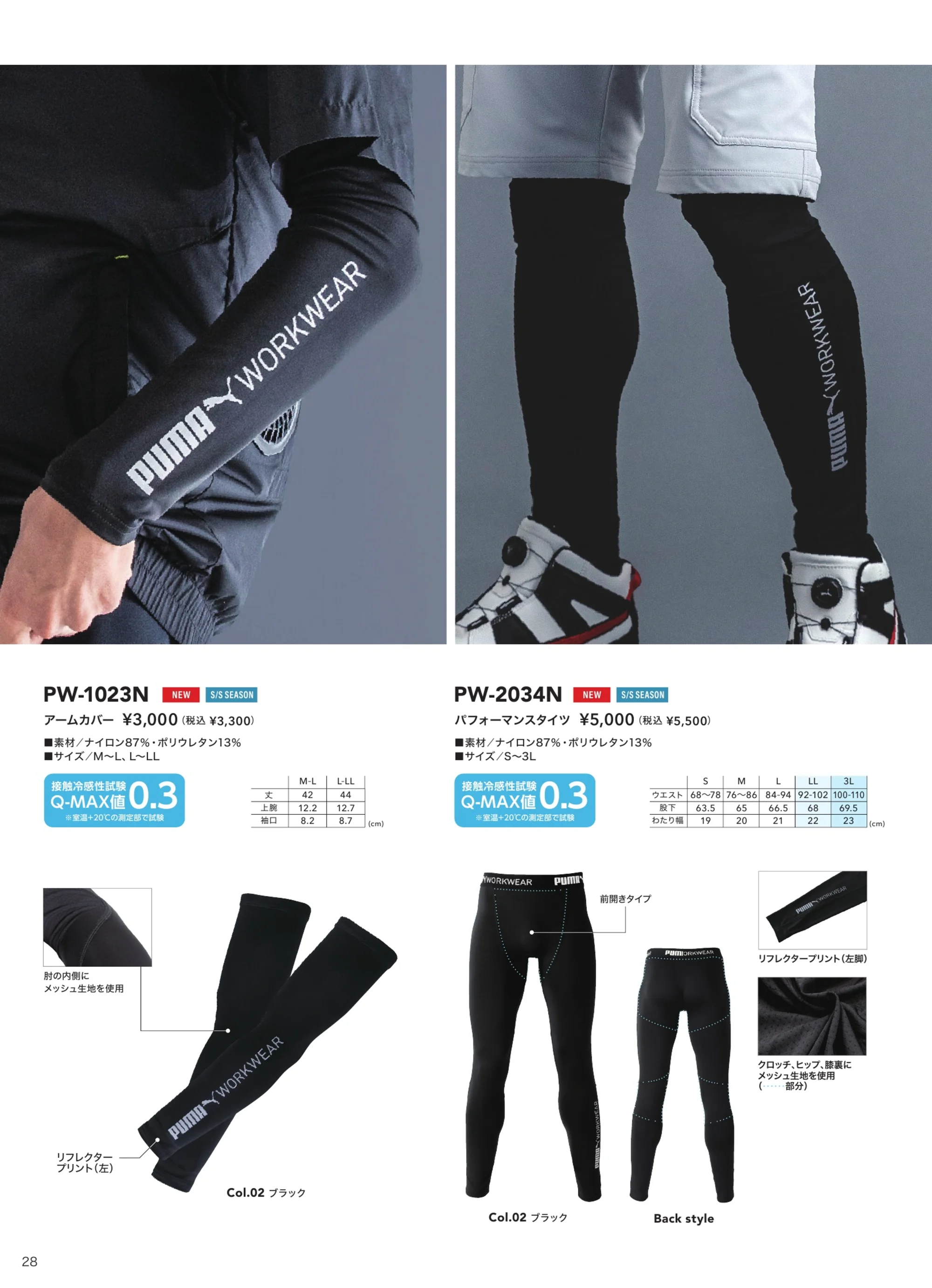 PUMA WORKWEAR パフォーマンスシリーズ 夏用コンプレッションタイツです。ナイロン87%・ポリウレタン13%素材を採用。クロッチ・ヒップ・膝裏にメッシュ素材を配置することで通気性を高め、長時間の作業でも快適なコンディションを保ちます。