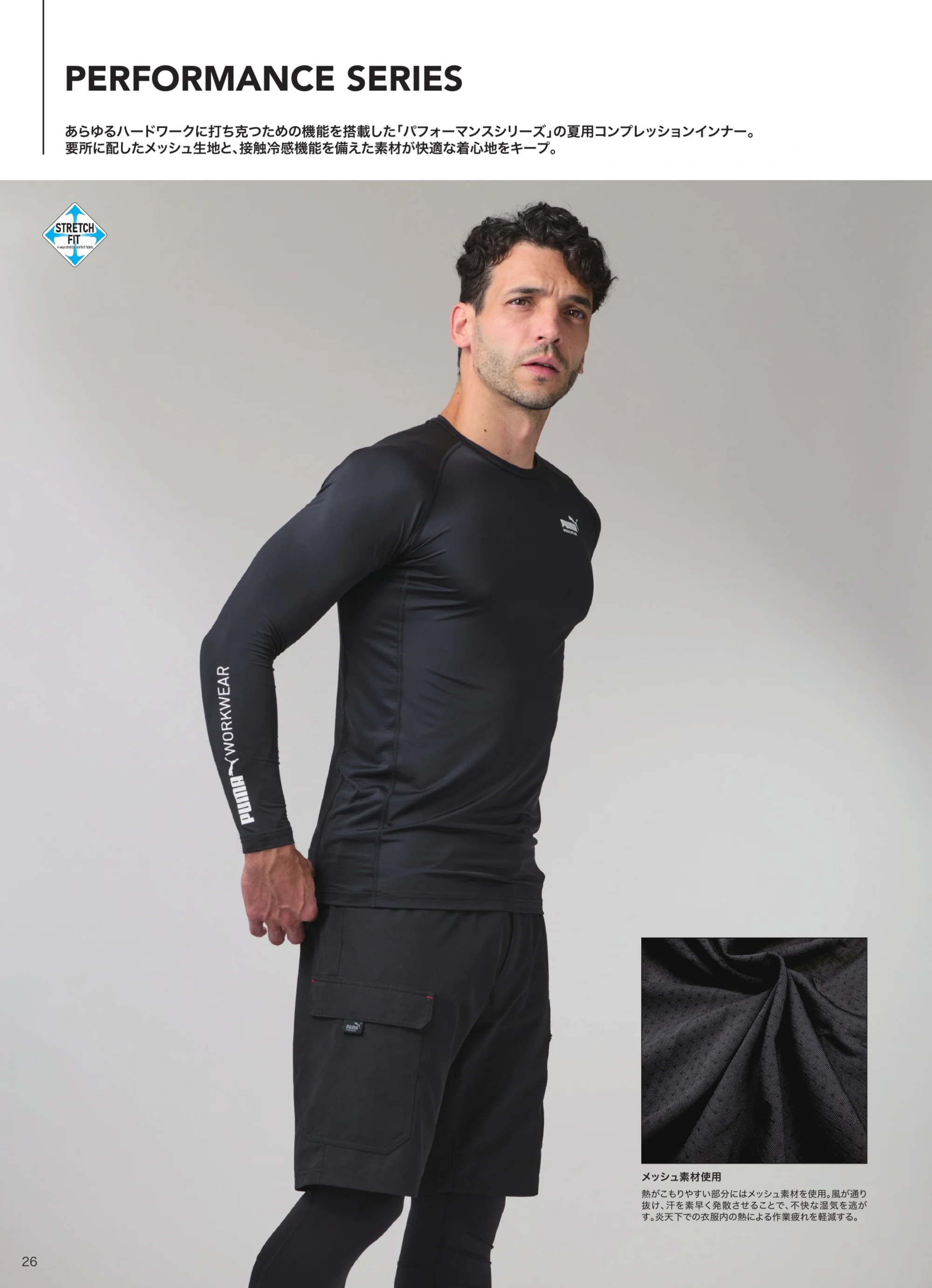 あらゆるハードワークに打ち克つための機能を搭載したパフォーマンスシリーズの夏用コンプレッションインナーです。ナイロン87%・ポリウレタン13%のストレッチ素材を使用。袖下・脇に配置したメッシュ生地が通気性を高め、暑さを感じやすい環境でも快適な着用感をキープします。
