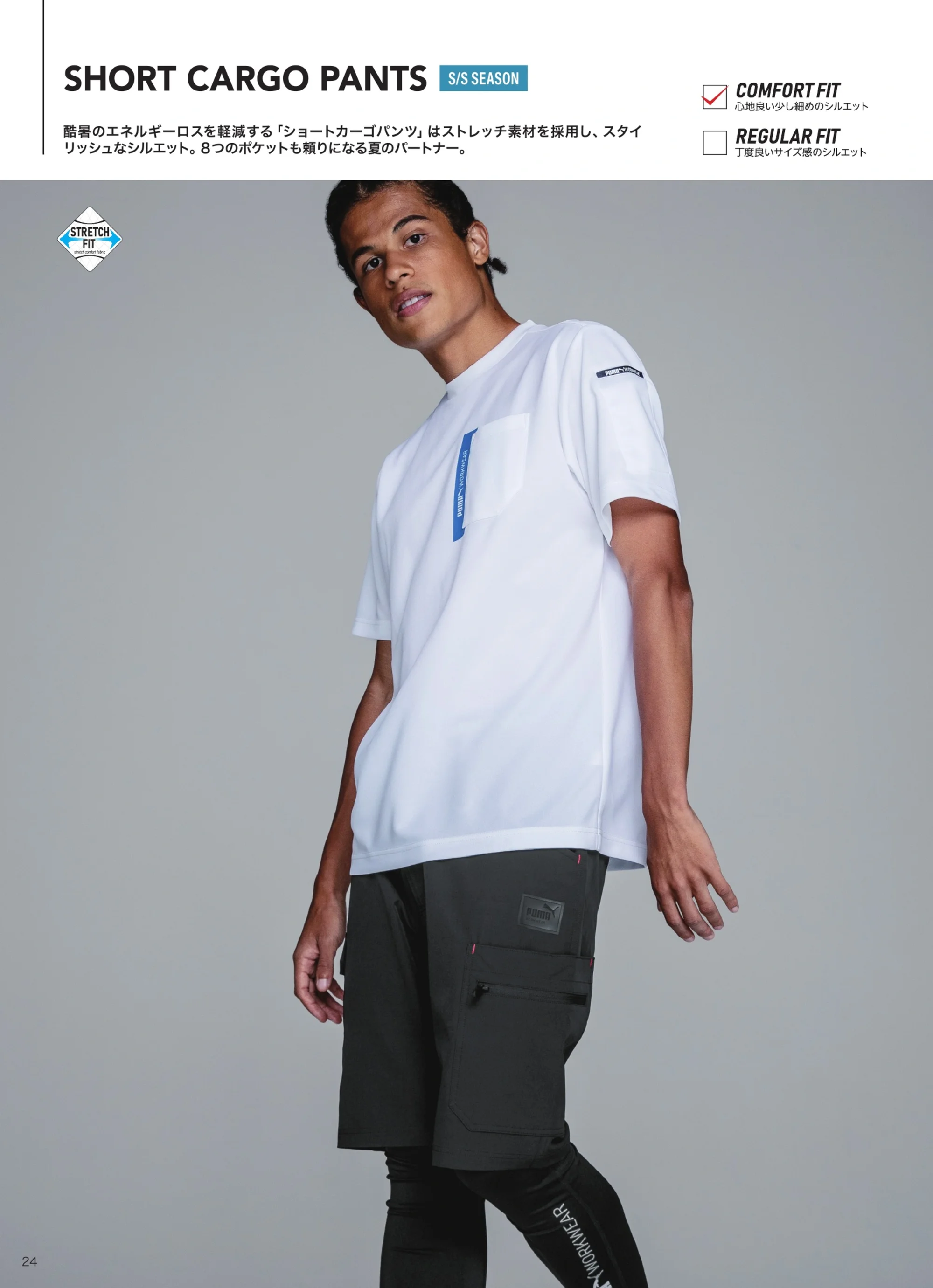 S/Sシーズンに対応したショートカーゴパンツです。ストレッチ素材を採用し、動きやすさと軽快な着用感を両立。酷暑のエネルギーロスを軽減し、スタイリッシュなシルエットと実用性を兼ね備えた、夏の現場で頼りになる一本です。