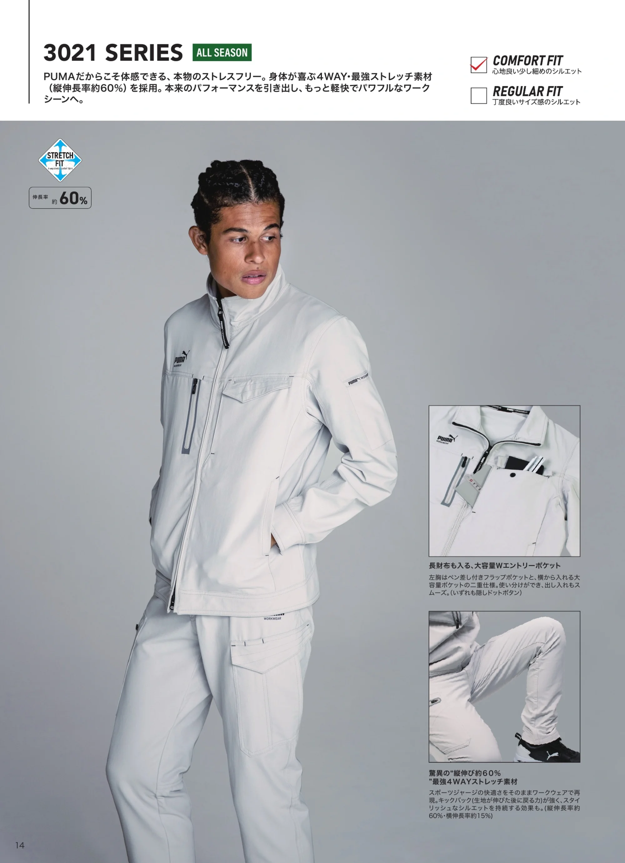 PUMA WORKWEARの3021シリーズとセットアップ対応のカーゴパンツです。伸長率約60%の4WAYストレッチ素材を採用し、しゃがむ・歩く・踏み出すといった動作をスムーズにサポート。快適なフィット感と高い機動力を兼ね備えた一本です。