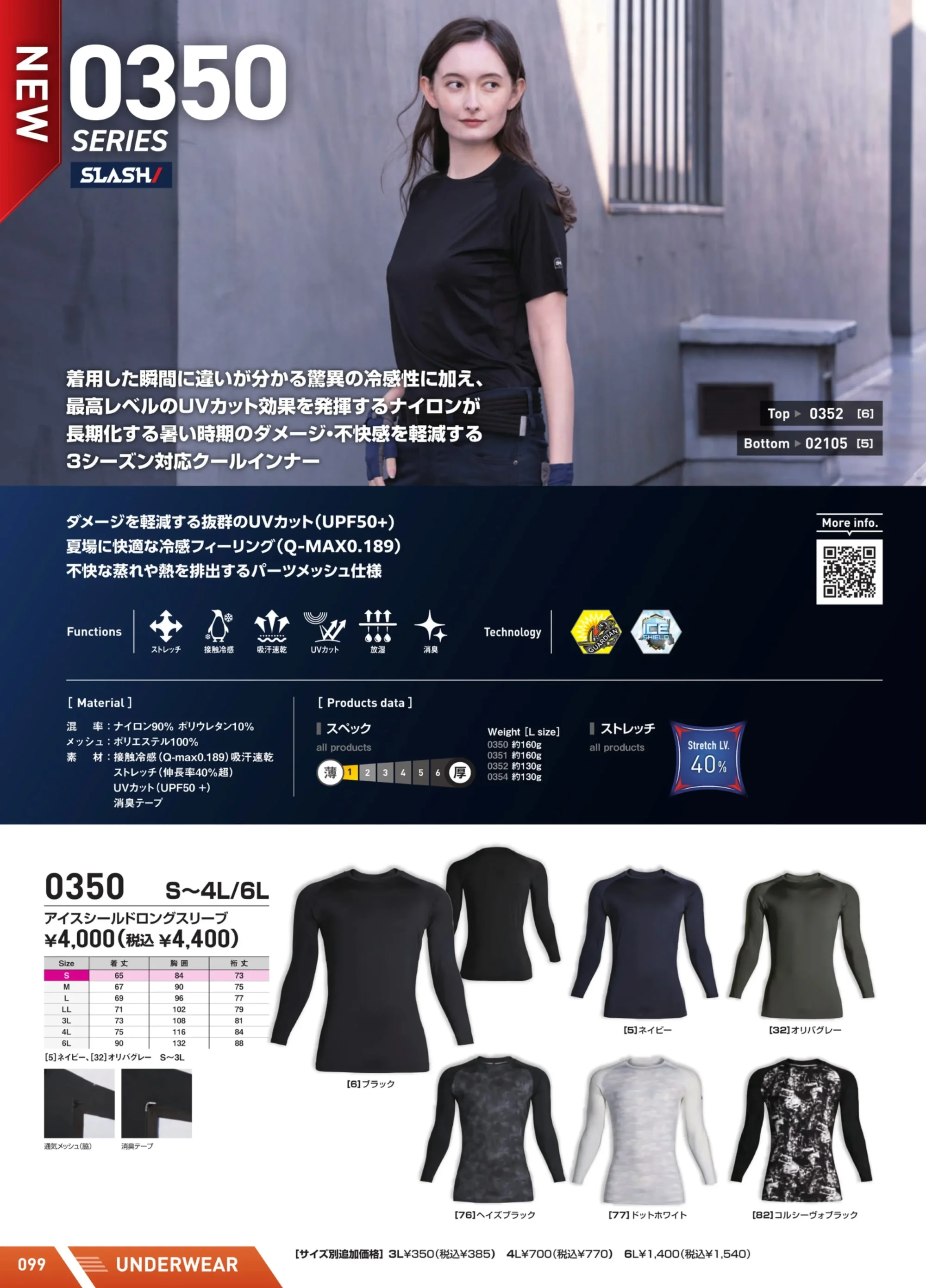 | 素材特長 | ストレッチ(伸縮率40%超) 接触冷感(Q-MAX0.189) UVカット(UPF50+) 吸汗速乾 放湿 消臭 |