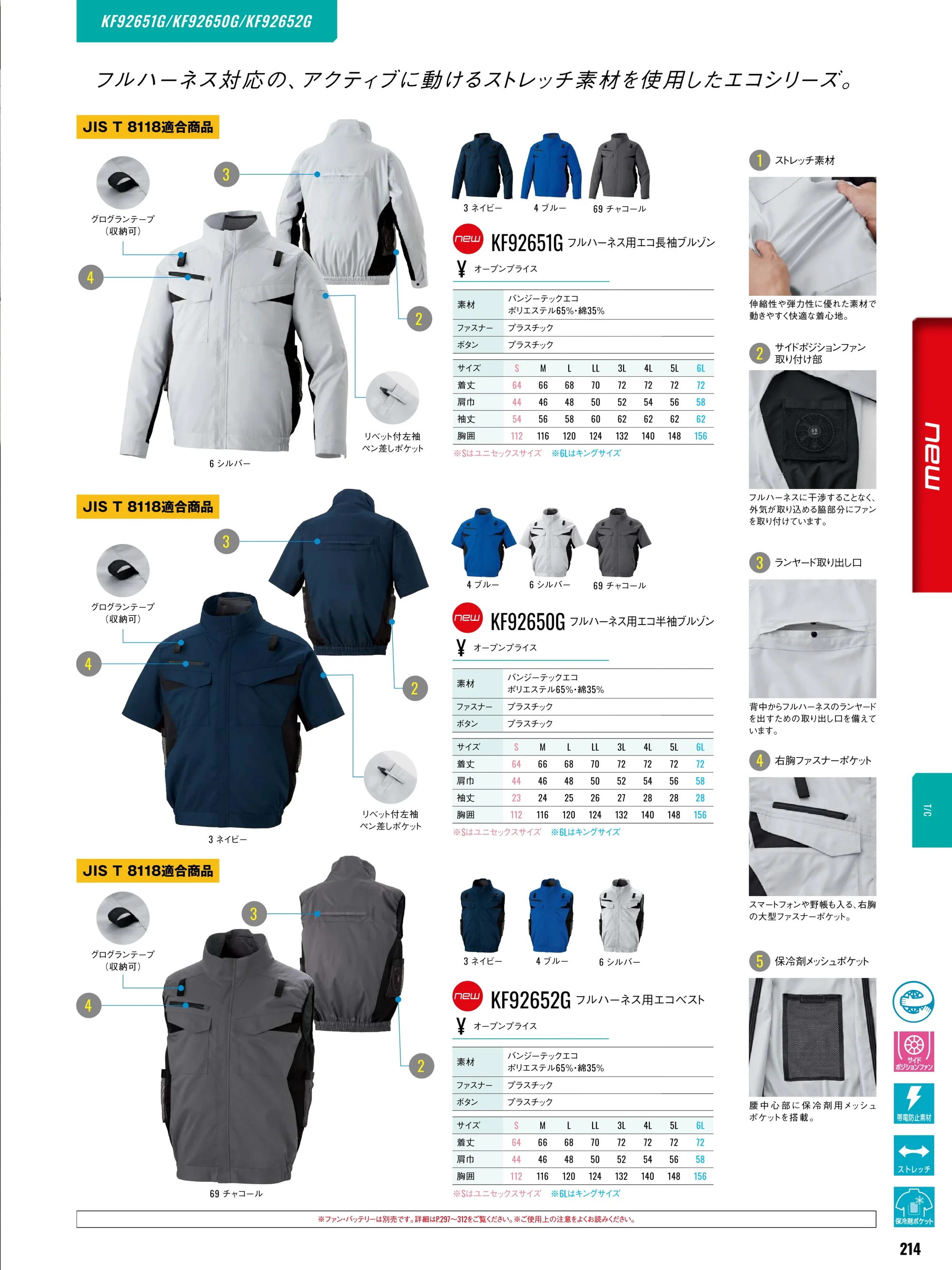 フルハーネス対応設計と高い運動性を両立したKF9265シリーズのエコベストです。再生ポリエステルを使用したストレッチ素材が身体の動きにしなやかに追従し 現場作業を快適にサポートします。JIS T 8118適合商品として安全性にも配慮した一着です。