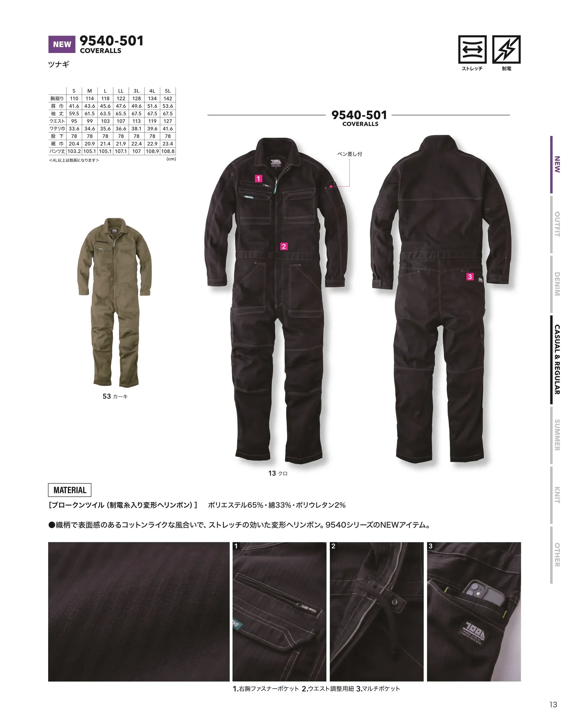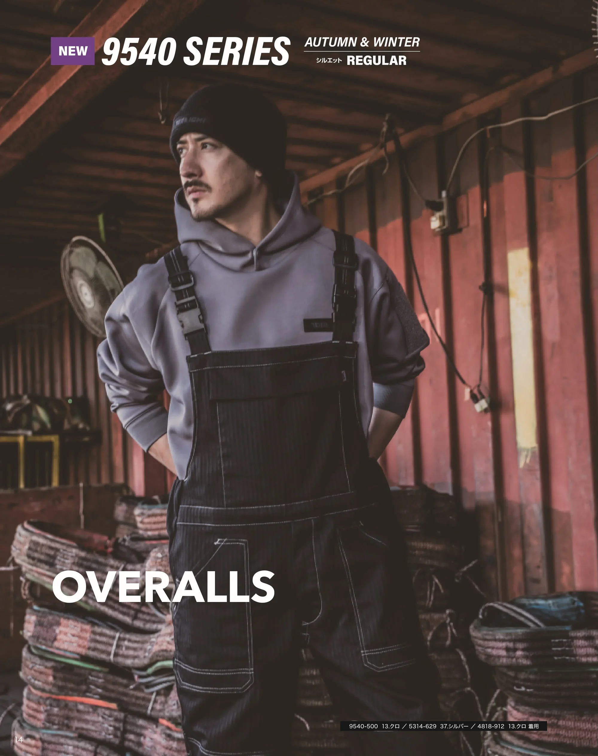 9540シリーズのサロペットは、繊柄で表面感のあるコットンライクな風合いとストレッチの効いた姿形ヘリンボン素材を採用しました。ポリエステル65%・綿33%・ポリウレタン2%の機能性素材で動きやすさと快適性を両立したオーバーオールです。