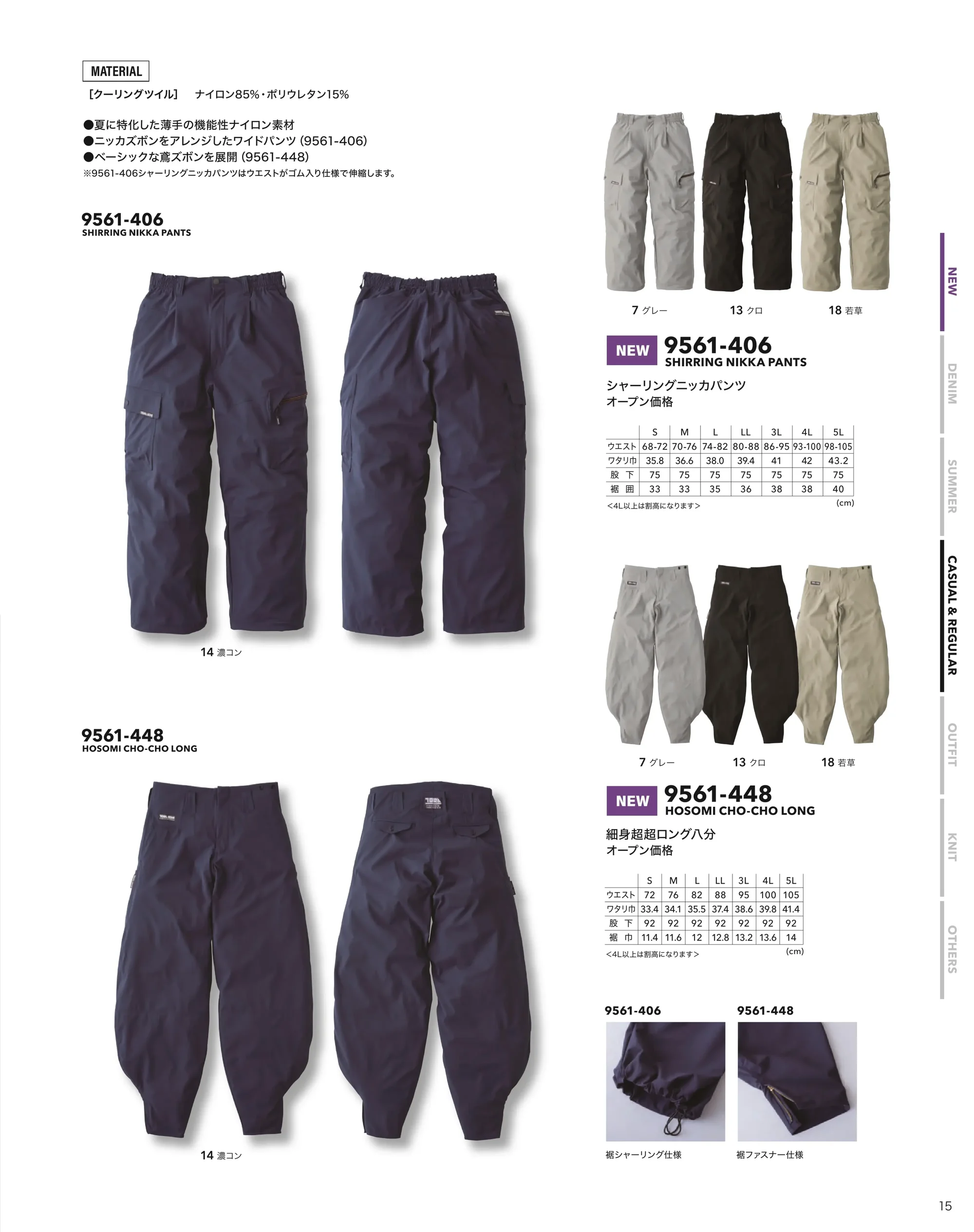 9561 SERIESのサマー対応鳶ズボン。クーリングツイル ナイロン85% ポリウレタン15%素材を採用し、接触冷感Qmax:0.35W cm²の清涼感と縦横2WAYストレッチを実現。ゆとりのあるLOOSEシルエットで、夏場の現場作業を快適にサポートします。